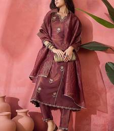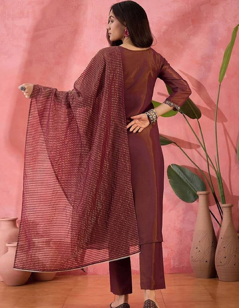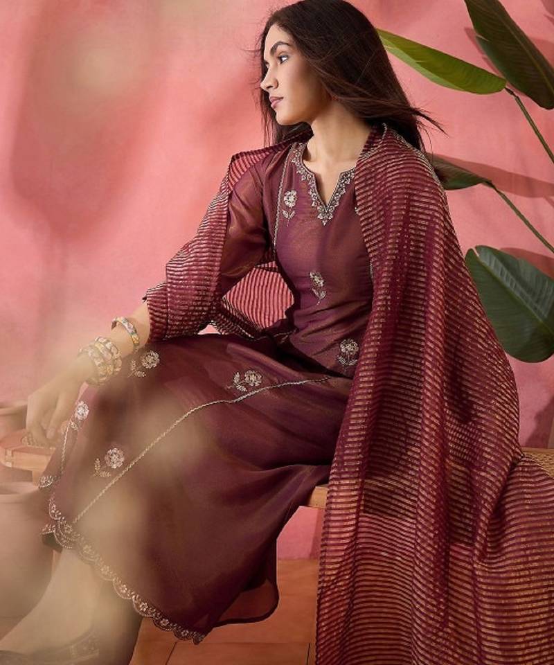 Label divine attire women’s maroon shimmer silk blend floral embroidered kurta pant set with dupatta