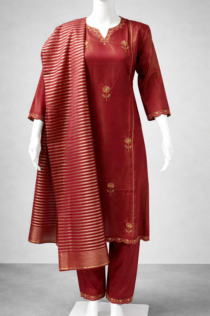 | Product Description | Elevate Your Festive And Occasion Wear Wardrobe With This Elegant Maroon Kurta Pant Set. Crafted In Premium Shimmer Silk Blend Fabric, The Kurta Features Beautiful Sequins And Thread Embroidery On The Neckline And Sleeves, Along With Delicate Floral Work All Over. Paired With A Matching Pant And A Soft, Flowing Dupatta, This Set Offers A Perfect Balance Of Comfort, Shine, And Traditional Charm—Ideal For Festive Gatherings, Functions, And Evening Events. |