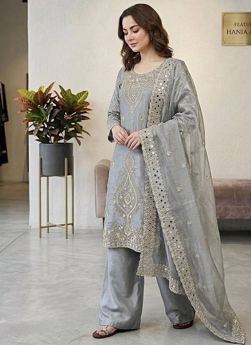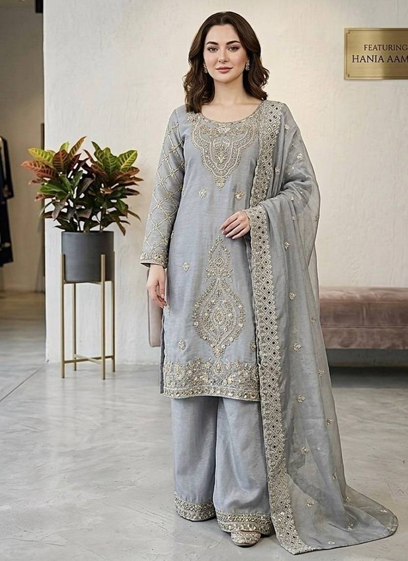 Grey silk blend embroidered beads work plazzo suit stitched