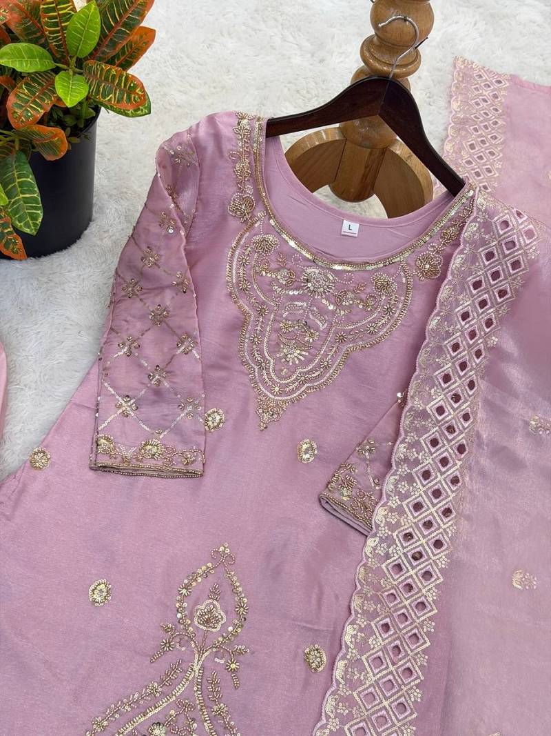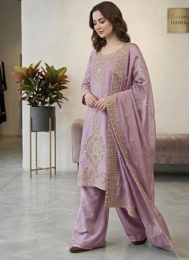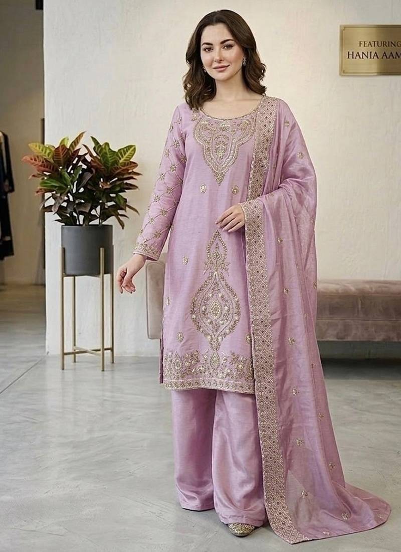 Lavender silk blend embroidered beads work plazzo suit stitched