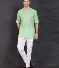 | Product Description | This Green Cotton Short Kurta Set Features A Plain Work Design With A Chinese Collar Neck And Full Sleeves. The Short Kurta Is Paired With A White Blended Cotton Pant In Trouser Style. Made From Breathable Fabric, The Stitched Set Offers Comfort And A Traditional Appearance. Includes One Kurta And One Pant. |