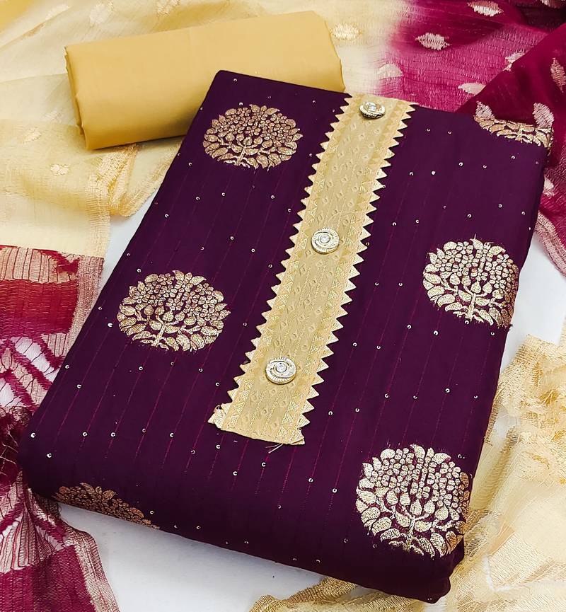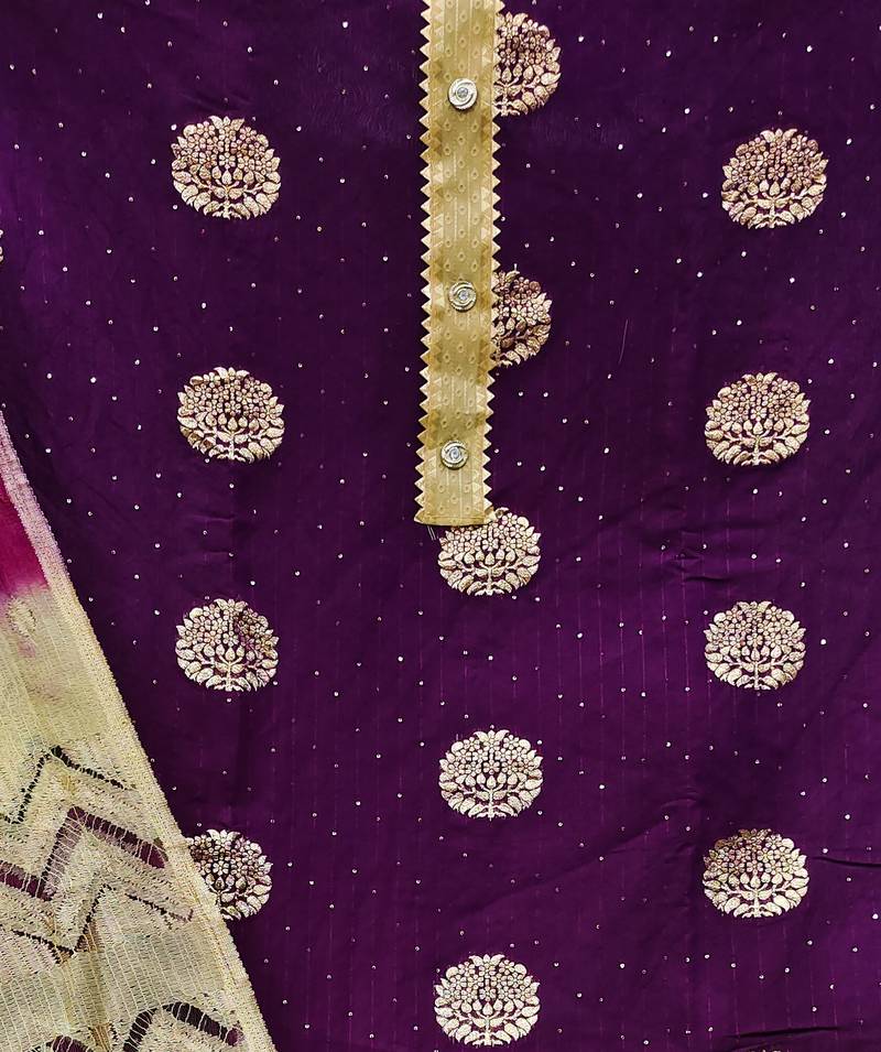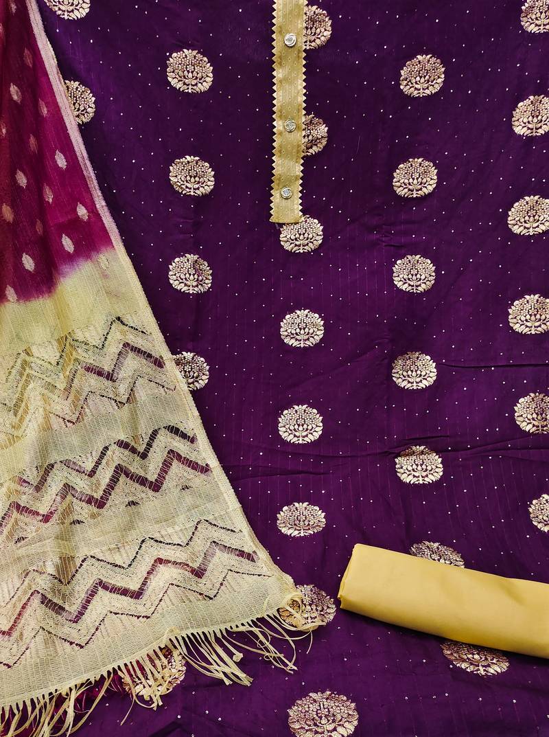 Banarasi buta sequin top with cotton bottom and saboori print dupatta set dress material unstitched