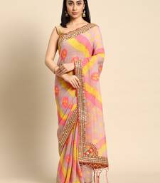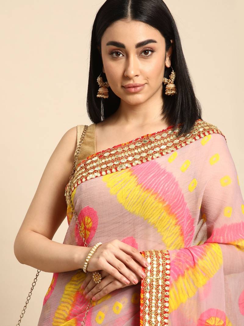 Pink bandhani saree with lace border and unstitched blouse piece