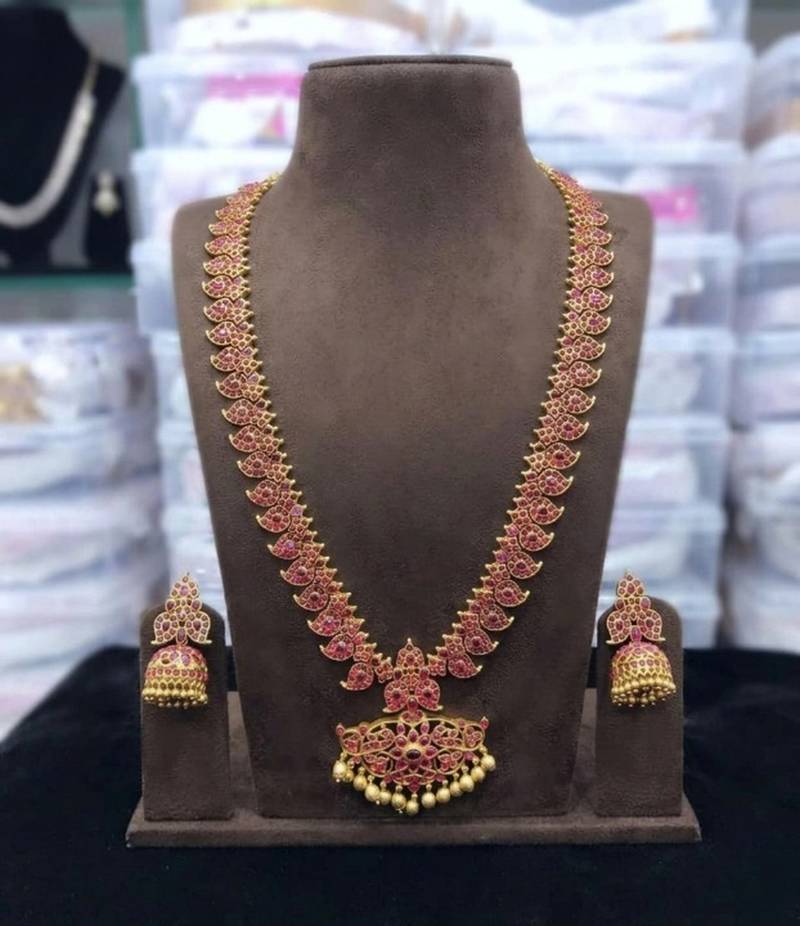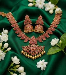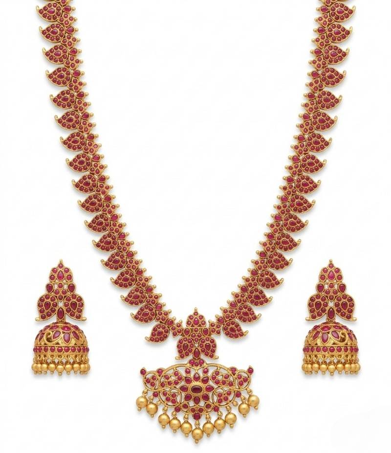 | Product Name | Elegant Ruby Red Matte Gold Plated Kemp Mango Haram Necklace Set With Jhumkas | |
