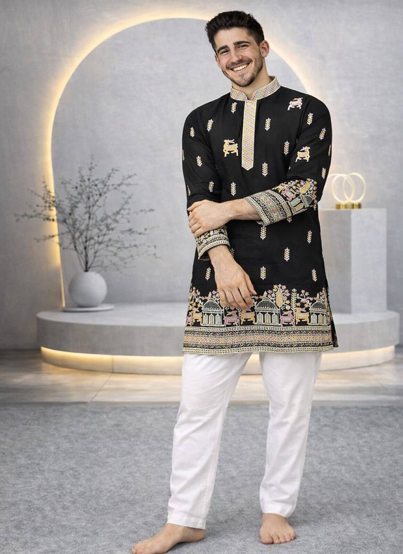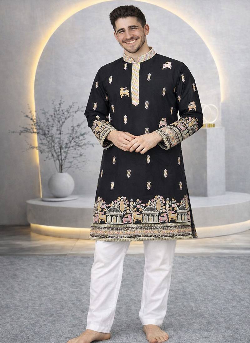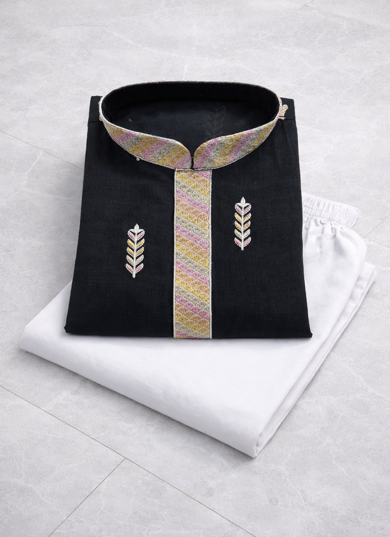 Product Name Black Color Multi Thread Embroidery Work Silk Kurta Payjama Set