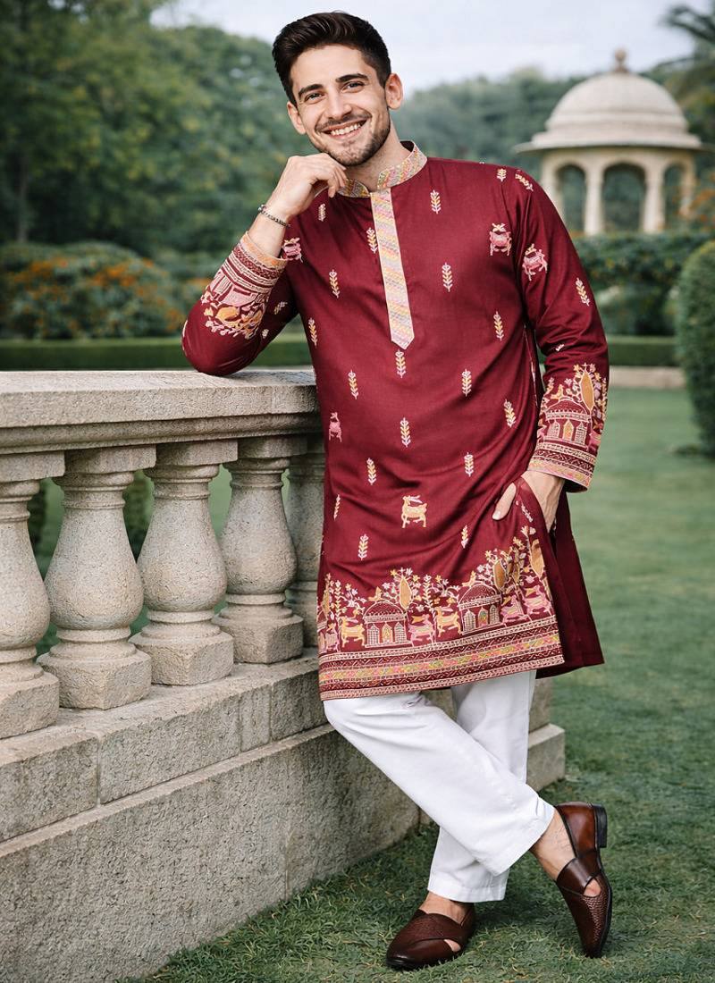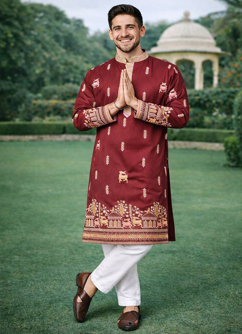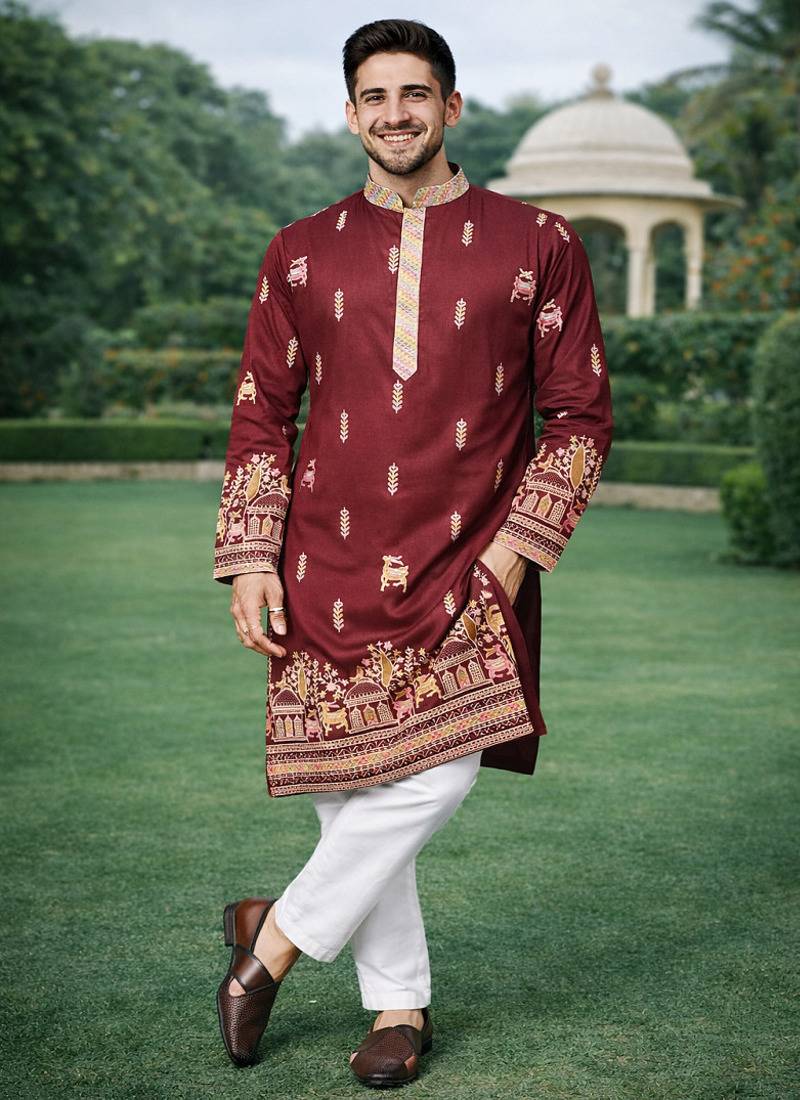 Product Name Maroon Color Multi Thread Embroidery Work Silk Kurta Payjama Set