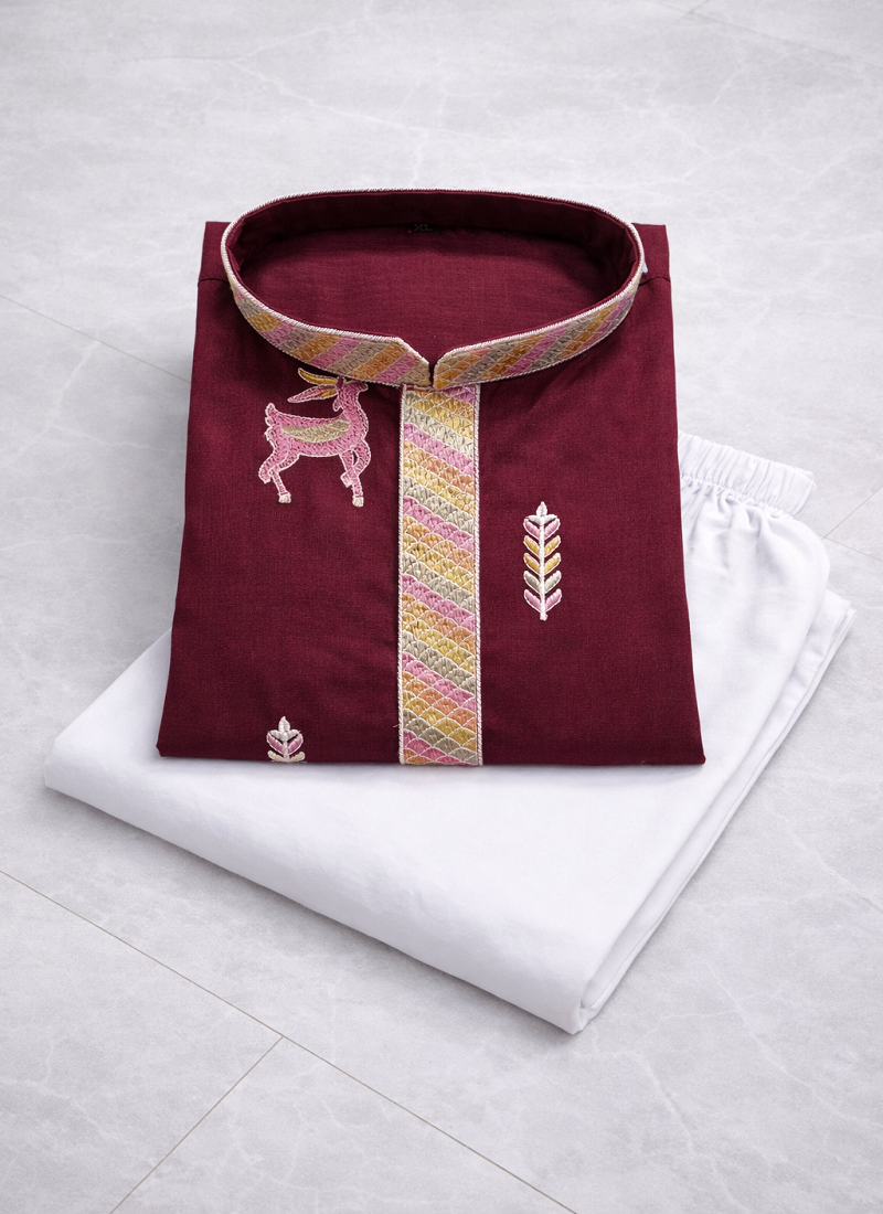Soft Silk Kurta Featuring Multi Thread Embroidery In A Deer Pattern Daaman Concept, Paired With Premium Raymond Cotton Pajama.