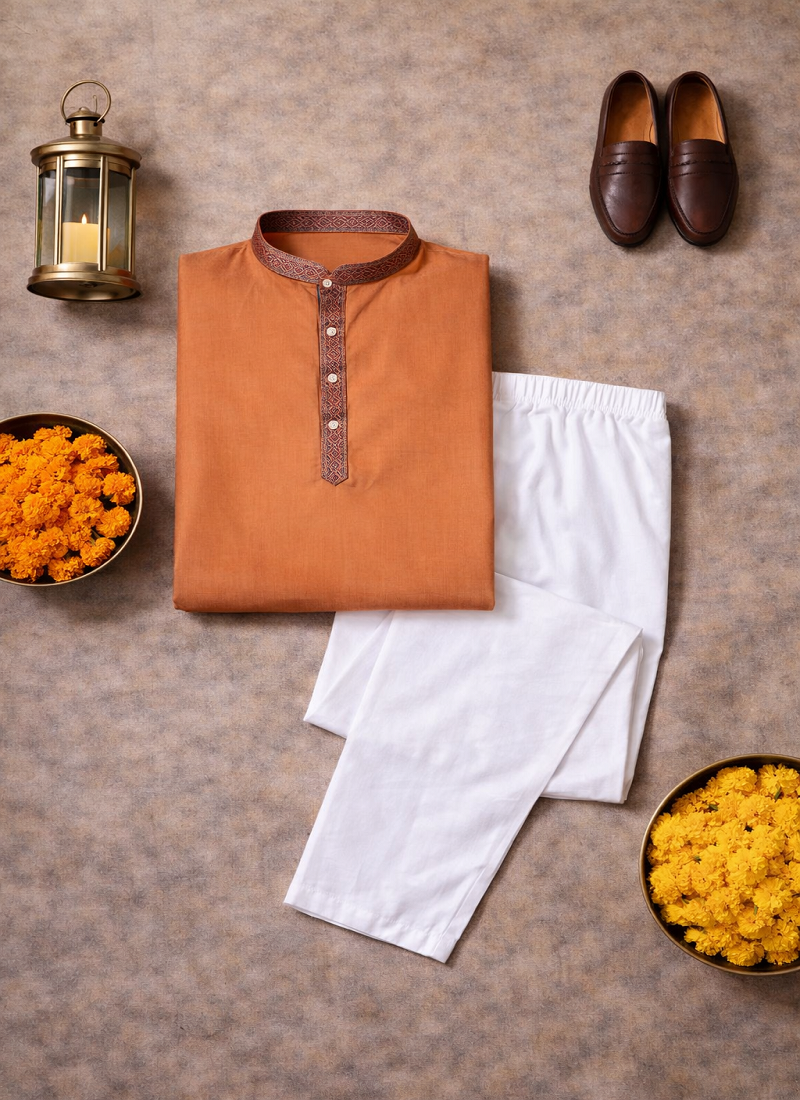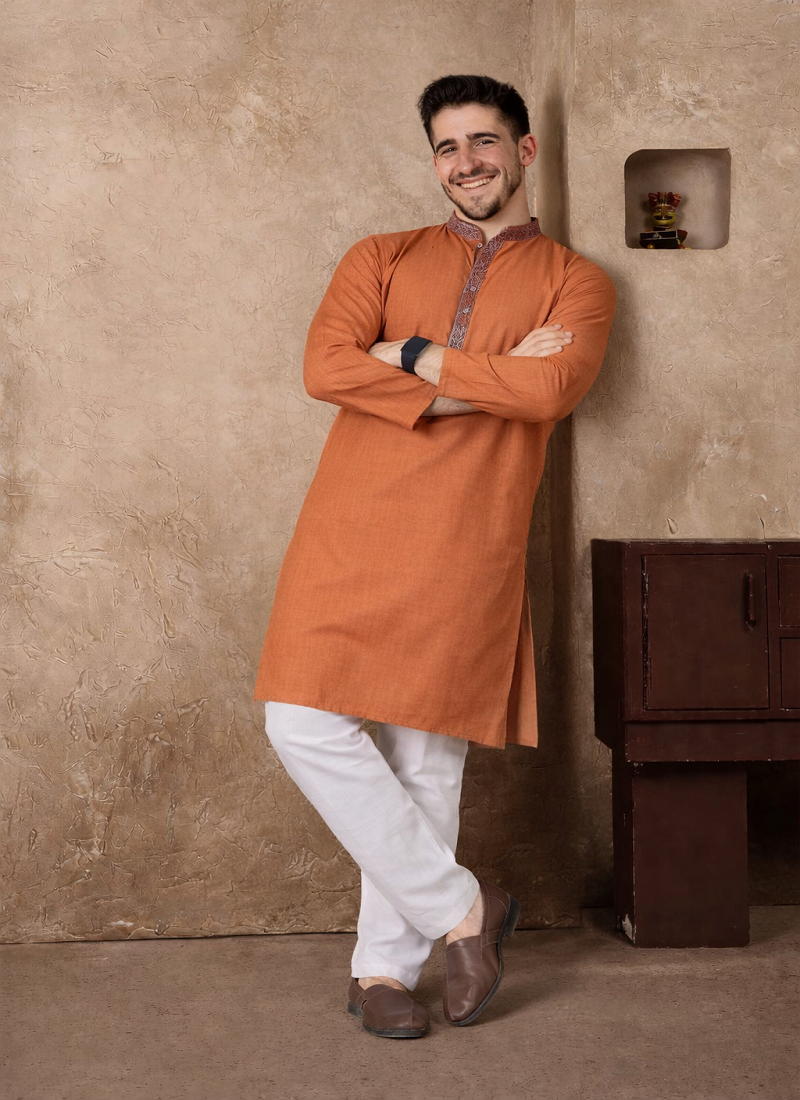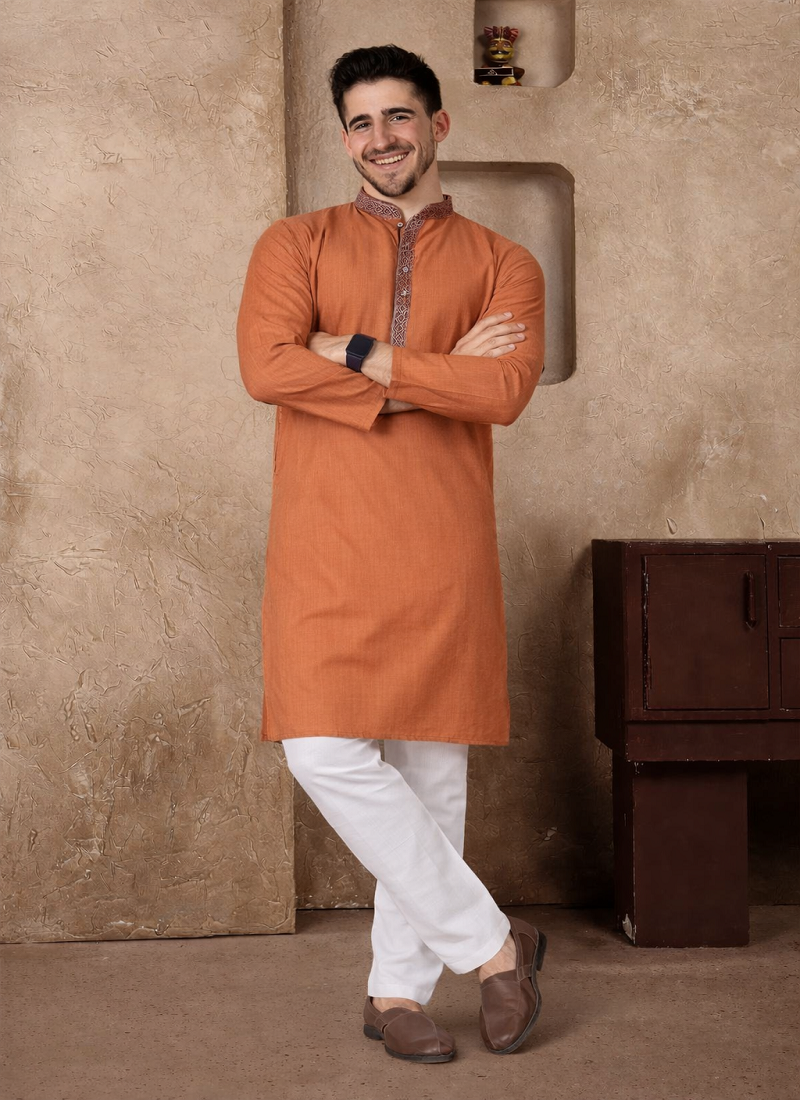 | Product Description | Simple And Stylish, The Orange Color Kurta Pajama Set Made From Linen Silk Fabric Gives A Comfortable Feel With A Neat Traditional Look. The Kurta Features Jacquard Weaving Work On The Neckline And Placket, Adding A Subtle Design Detail Without Making The Outfit Look Heavy. The Orange Color Jacquard Weaving Work Linen Silk Kurta Pajama Set Is Suitable For Festive Wear, Family Functions, And Traditional Occasions. The Fabric Is Light, Breathable, And Comfortable, Making It A Good Choice For Long Hours Of Wear While Still Looking Well Dressed. |