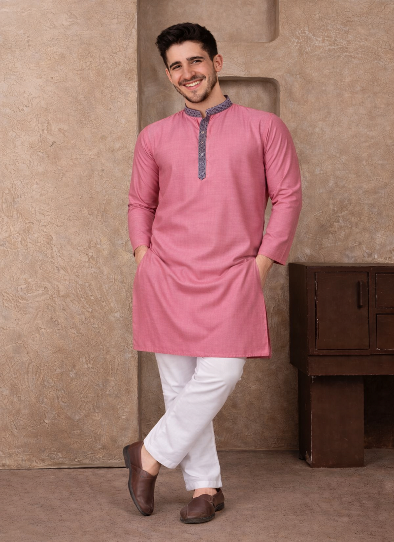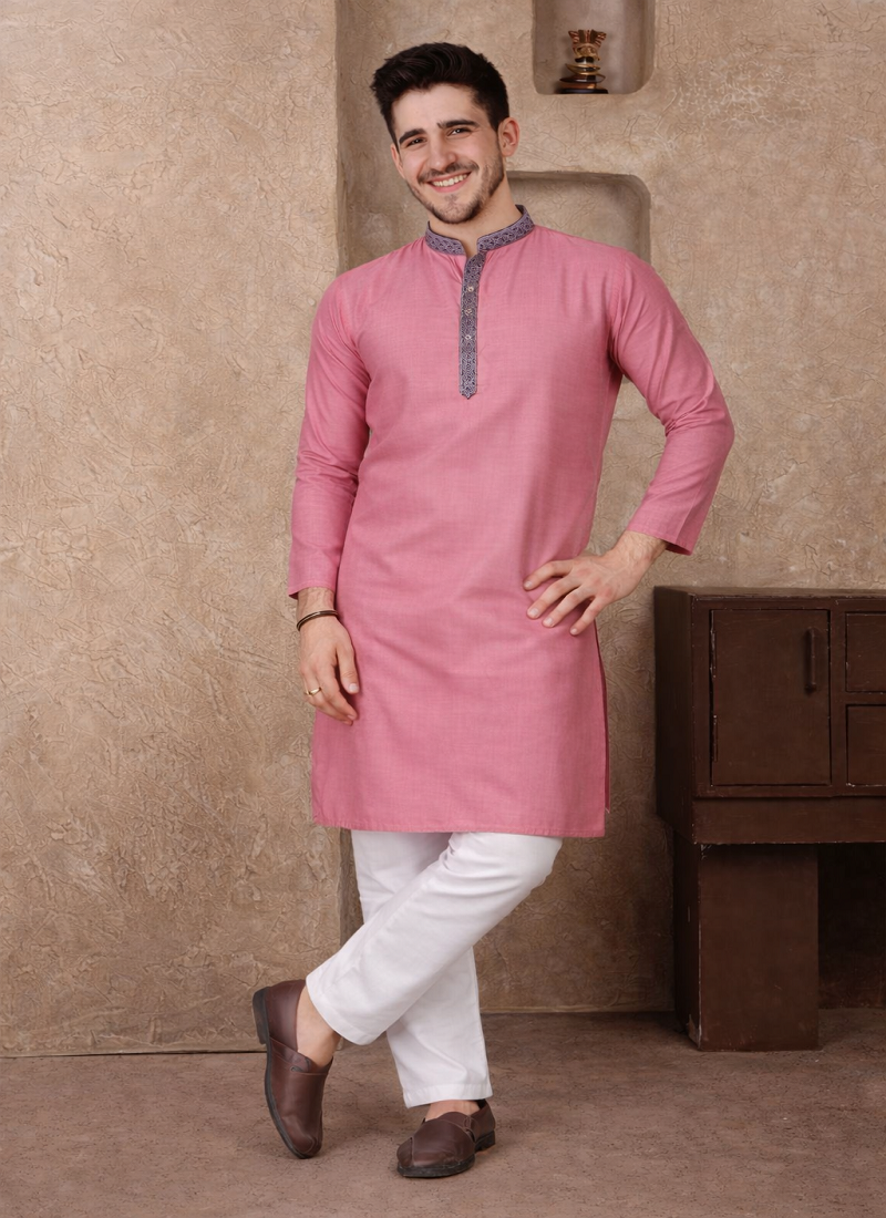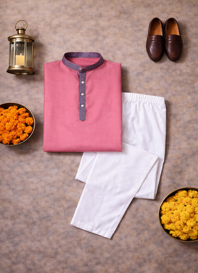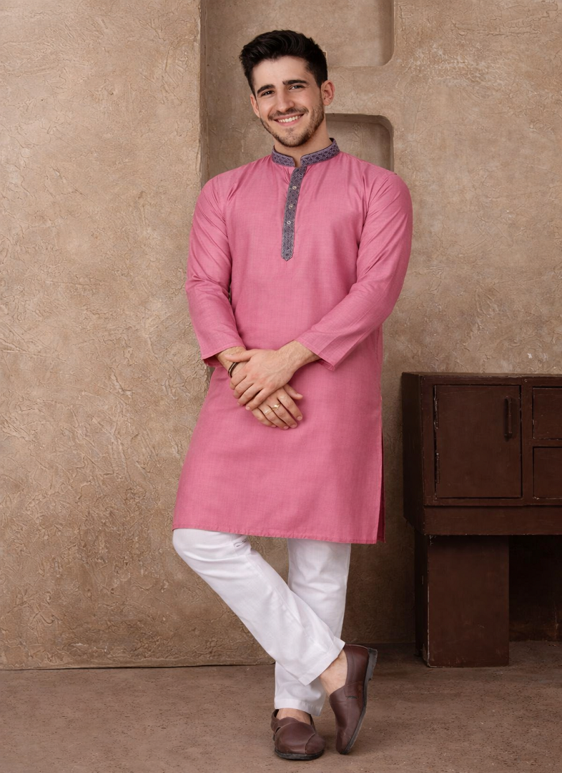 | Product Description | Simple And Stylish, The Pink Color Kurta Pajama Set Made From Linen Silk Fabric Gives A Comfortable Feel With A Neat Traditional Look. The Kurta Features Jacquard Weaving Work On The Neckline And Placket, Adding A Subtle Design Detail Without Making The Outfit Look Heavy. The Pink Color Jacquard Weaving Work Linen Silk Kurta Pajama Set Is Suitable For Festive Wear, Family Functions, And Traditional Occasions. The Fabric Is Light, Breathable, And Comfortable, Making It A Good Choice For Long Hours Of Wear While Still Looking Well Dressed. |
