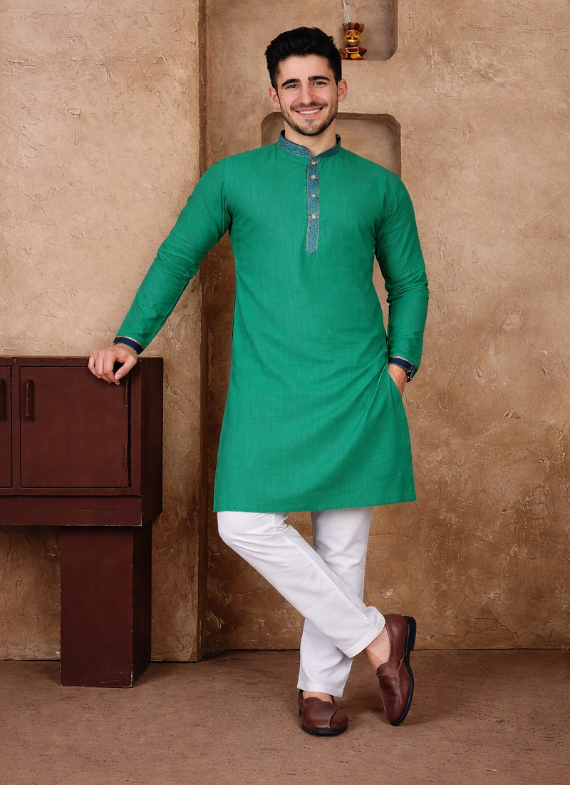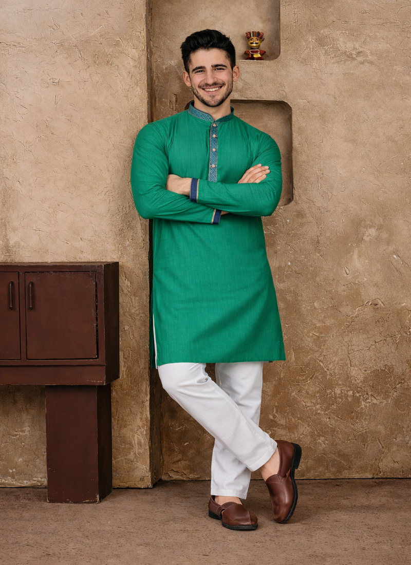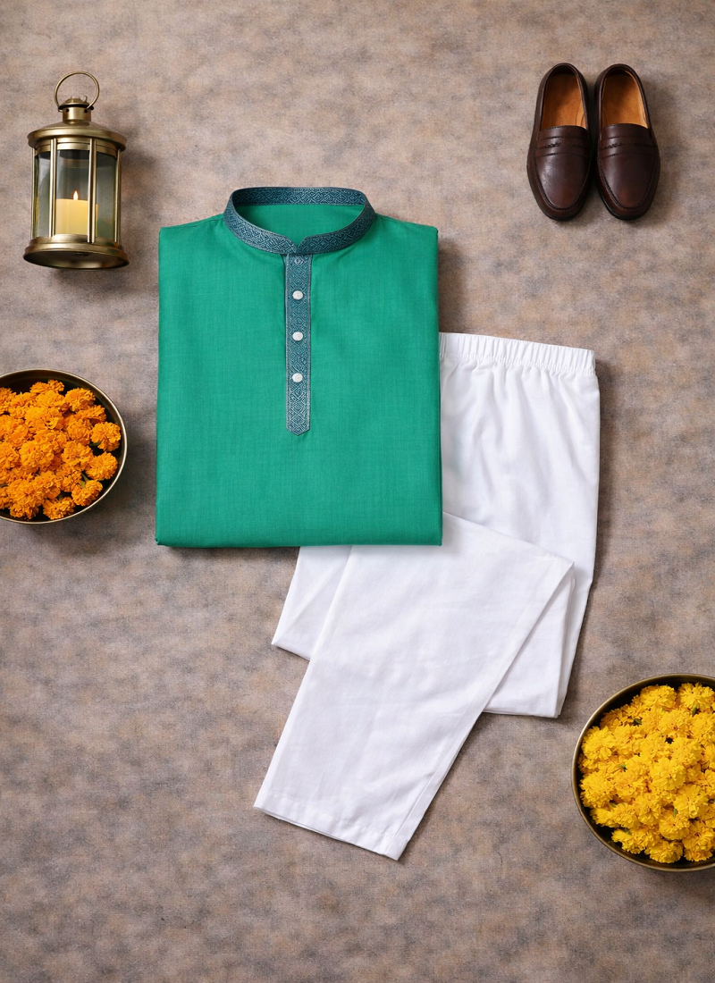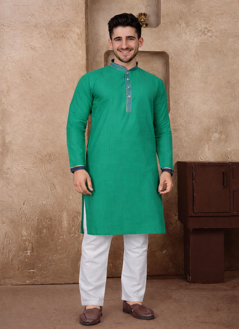 | Product Description | Simple And Stylish, The Turquoise Color Kurta Pajama Set Made From Linen Silk Fabric Gives A Comfortable Feel With A Neat Traditional Look. The Kurta Features Jacquard Weaving Work On The Neckline And Placket, Adding A Subtle Design Detail Without Making The Outfit Look Heavy. The Turquoise Color Jacquard Weaving Work Linen Silk Kurta Pajama Set Is Suitable For Festive Wear, Family Functions, And Traditional Occasions. The Fabric Is Light, Breathable, And Comfortable, Making It A Good Choice For Long Hours Of Wear While Still Looking Well Dressed. |