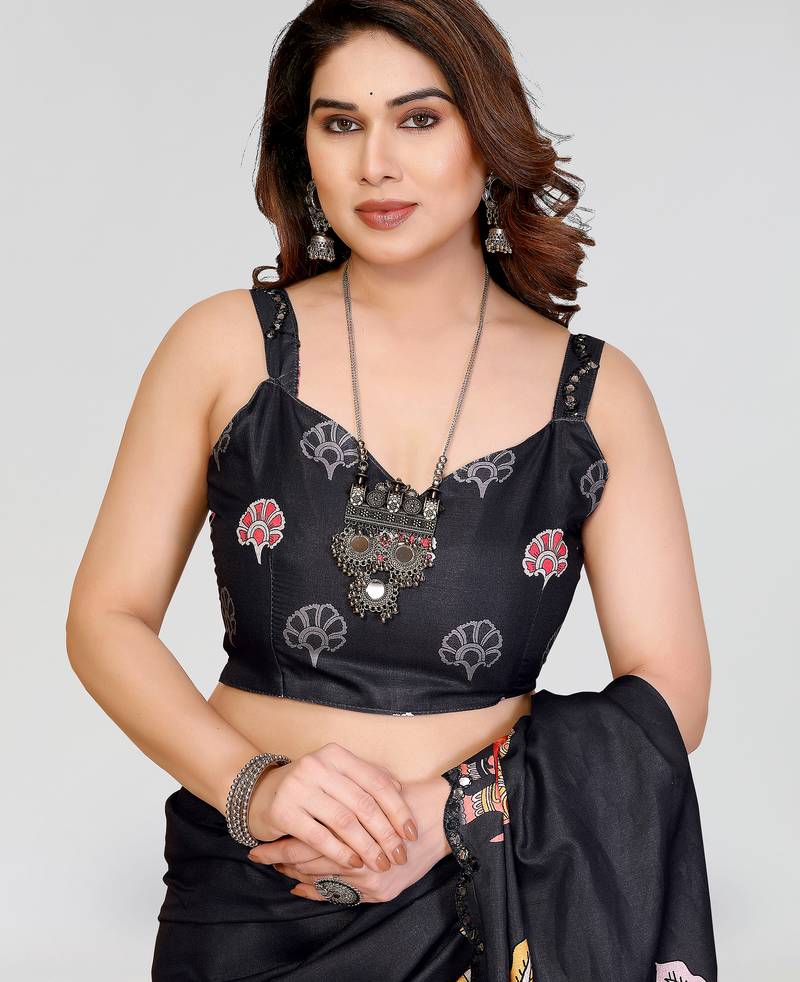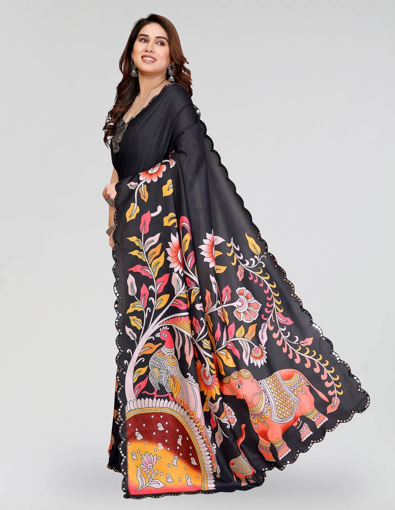 | Product Name | Black Manipuri Silk Kalamkari Digital Print Saree With Mirror Work Border | |