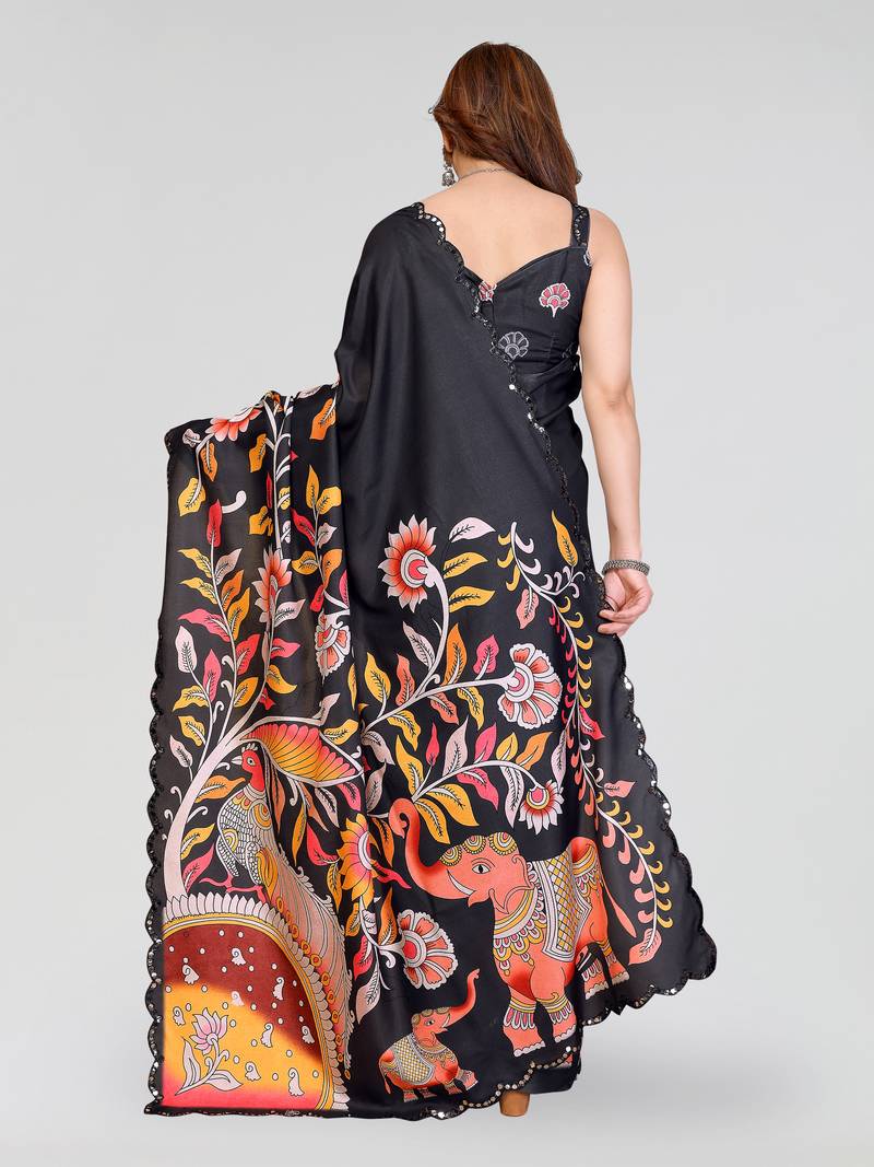 Black manipuri silk kalamkari digital print saree with mirror work border