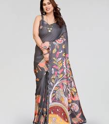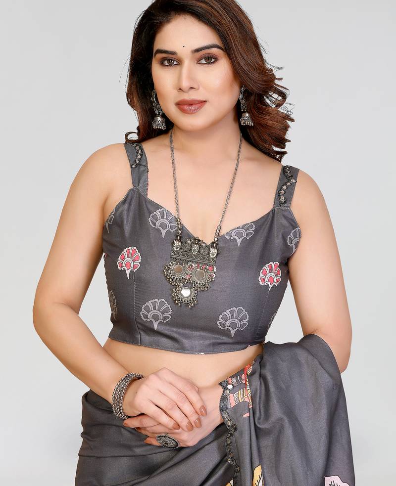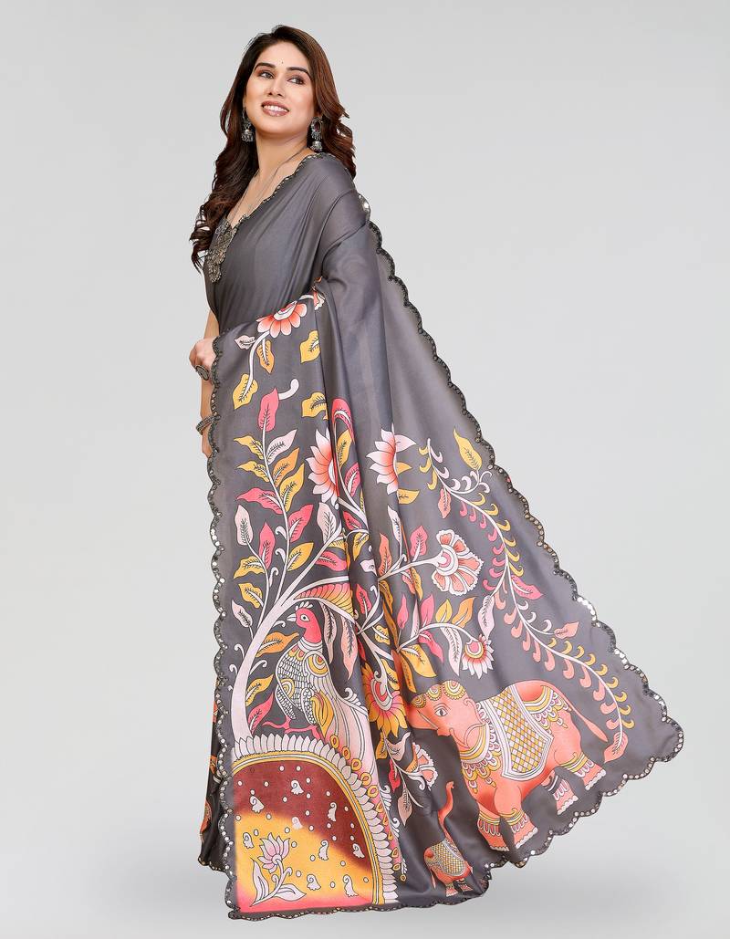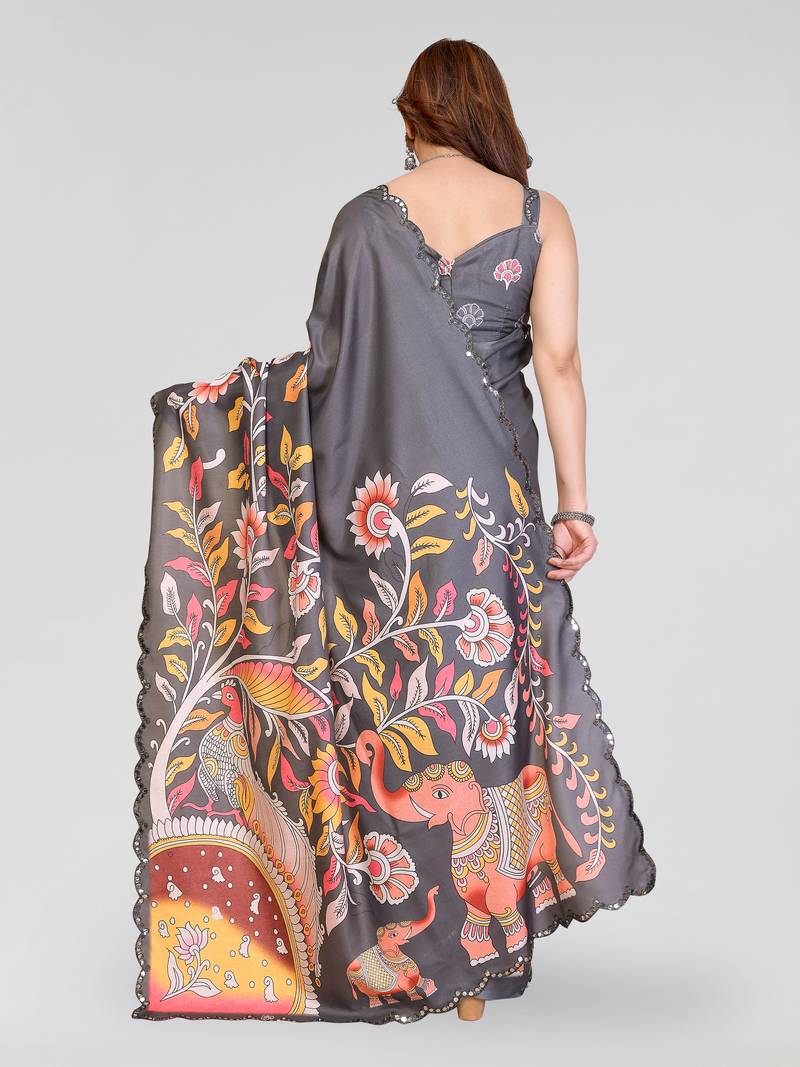 | Product Name | Grey Manipuri Silk Kalamkari Digital Print Saree With Mirror Work Border | |