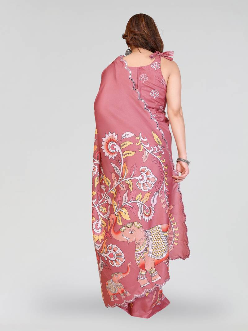 Peach manipuri silk kalamkari digital print saree with mirror work border