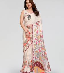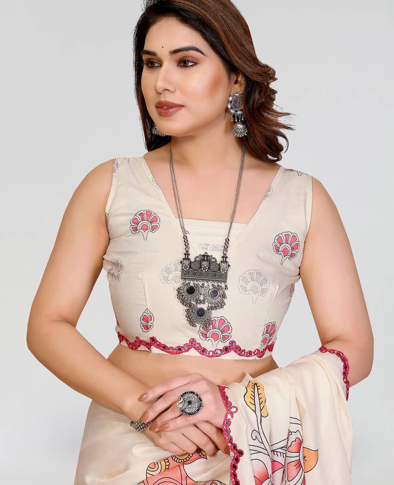 White manipuri silk kalamkari digital print saree with mirror work border