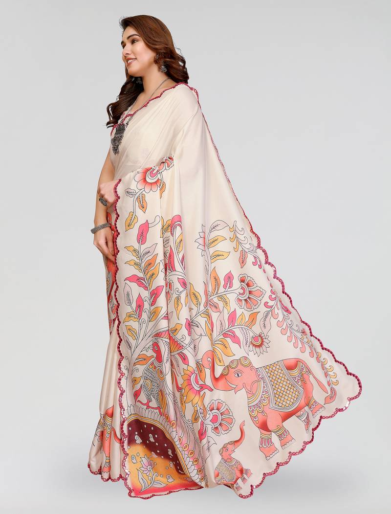 | Product Name | White Manipuri Silk Kalamkari Digital Print Saree With Mirror Work Border | |