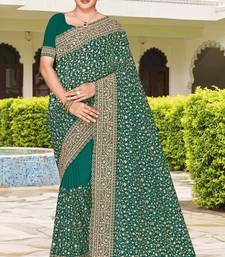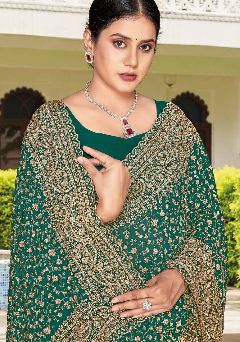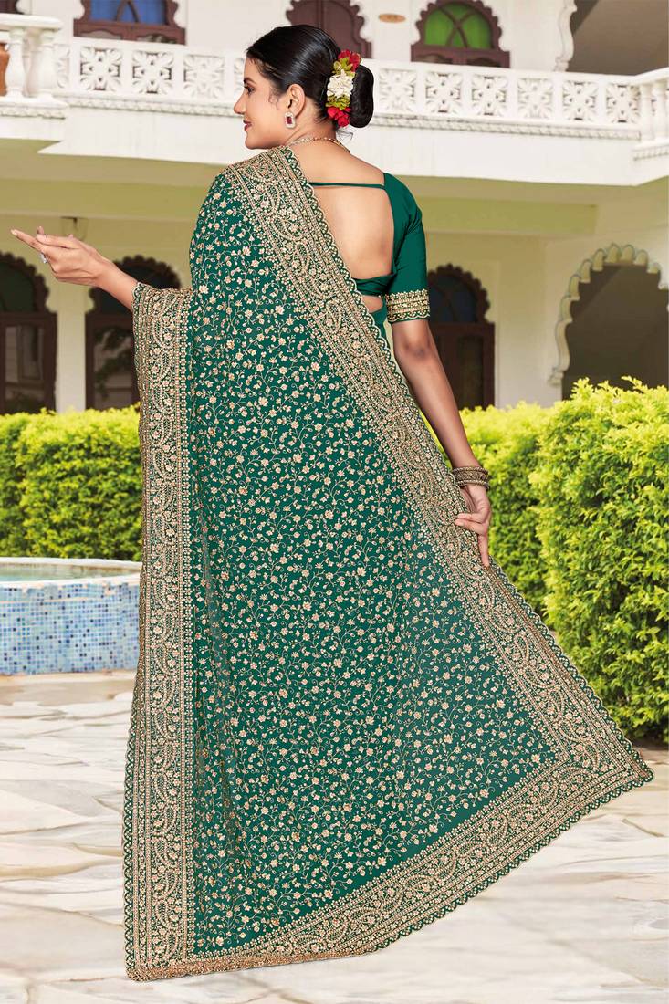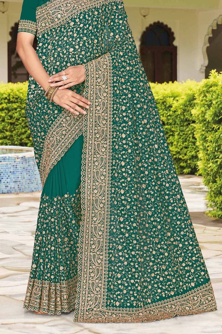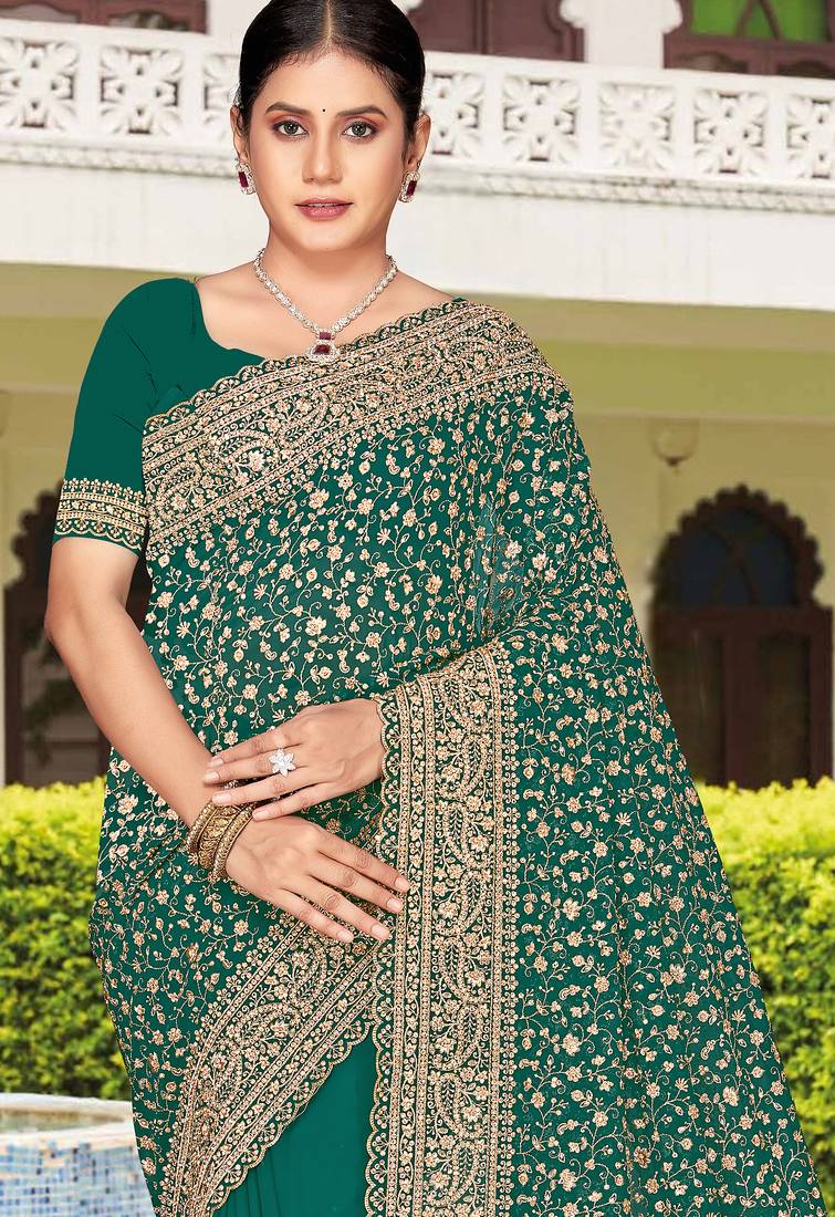 Teal green zarkan embroidered georgette designer saree for women