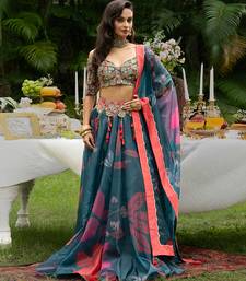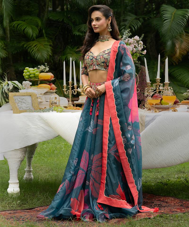 Teal printed organza lehenga set