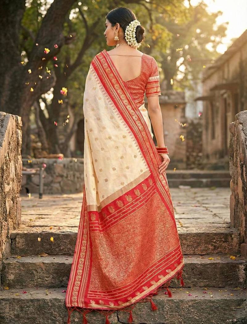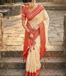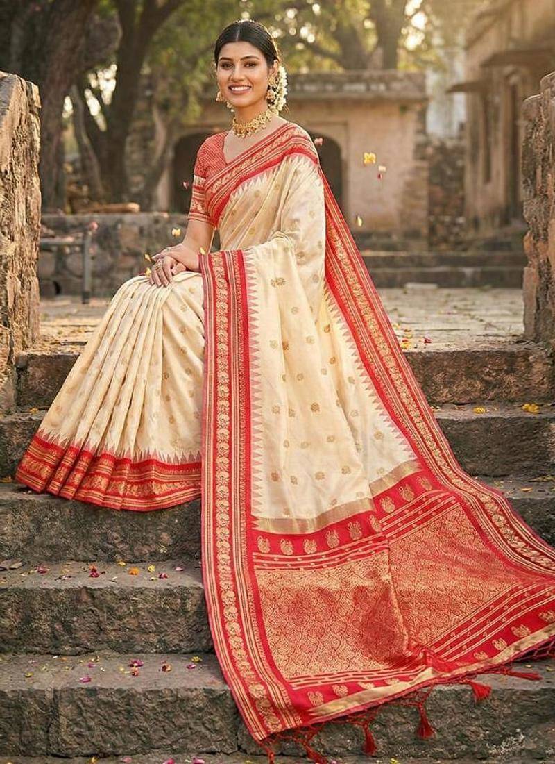 Cream color woven work soft silk party wear saree with blouse