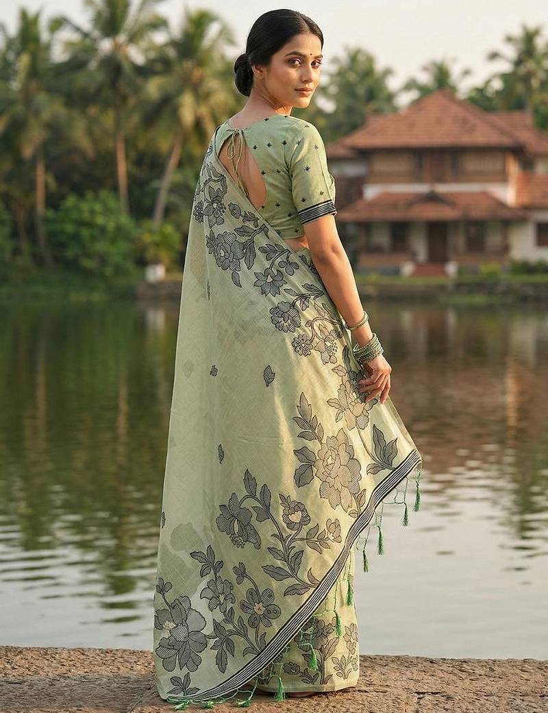 | Product Name | Light Green Linen Cotton Print & Embroidered Work Saree With Blouse | |