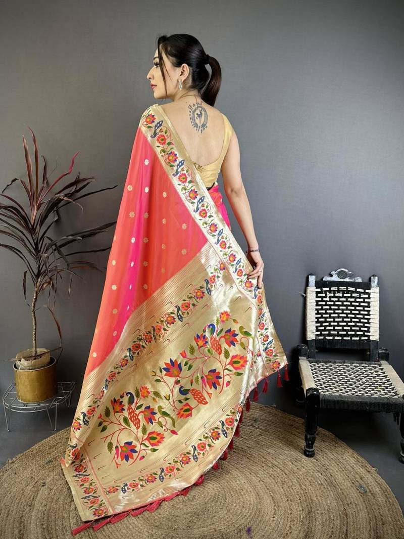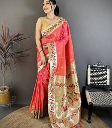 Orange color zari woven paithani silk saree with blouse