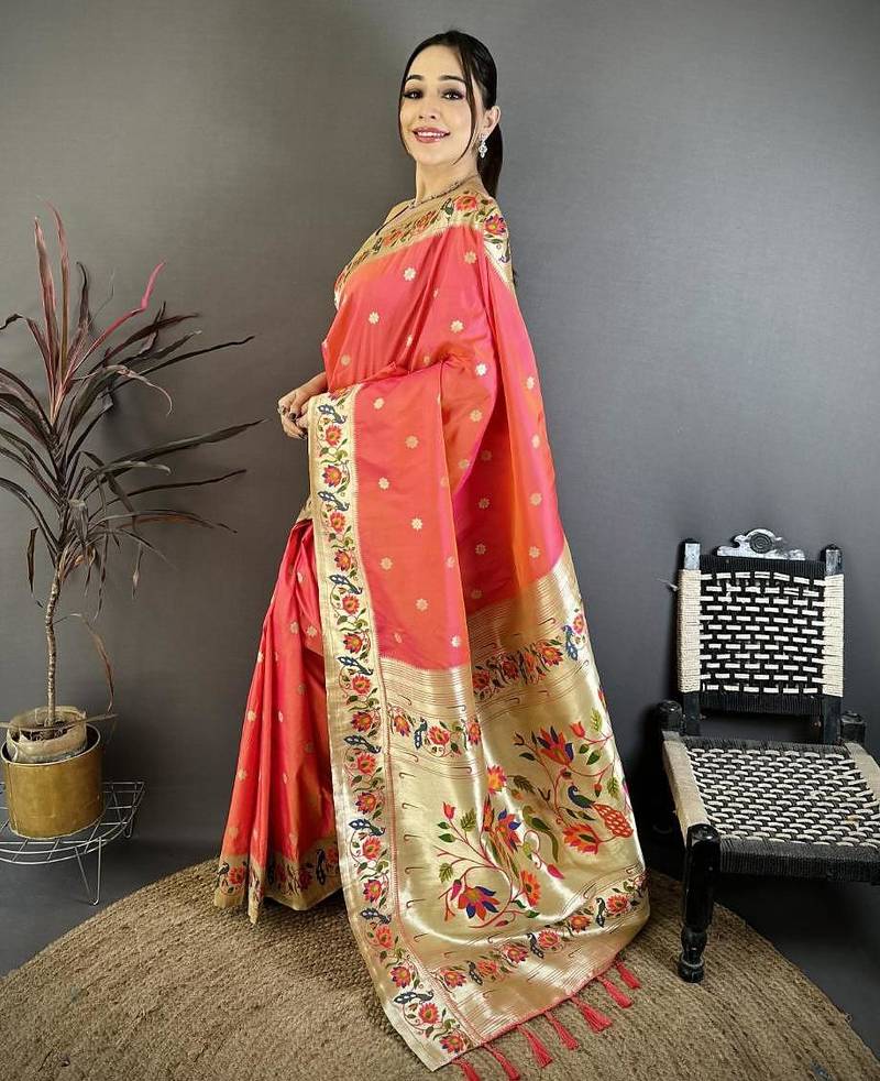 | Product Name | Orange Color Zari Woven Paithani Silk Saree With Blouse | |