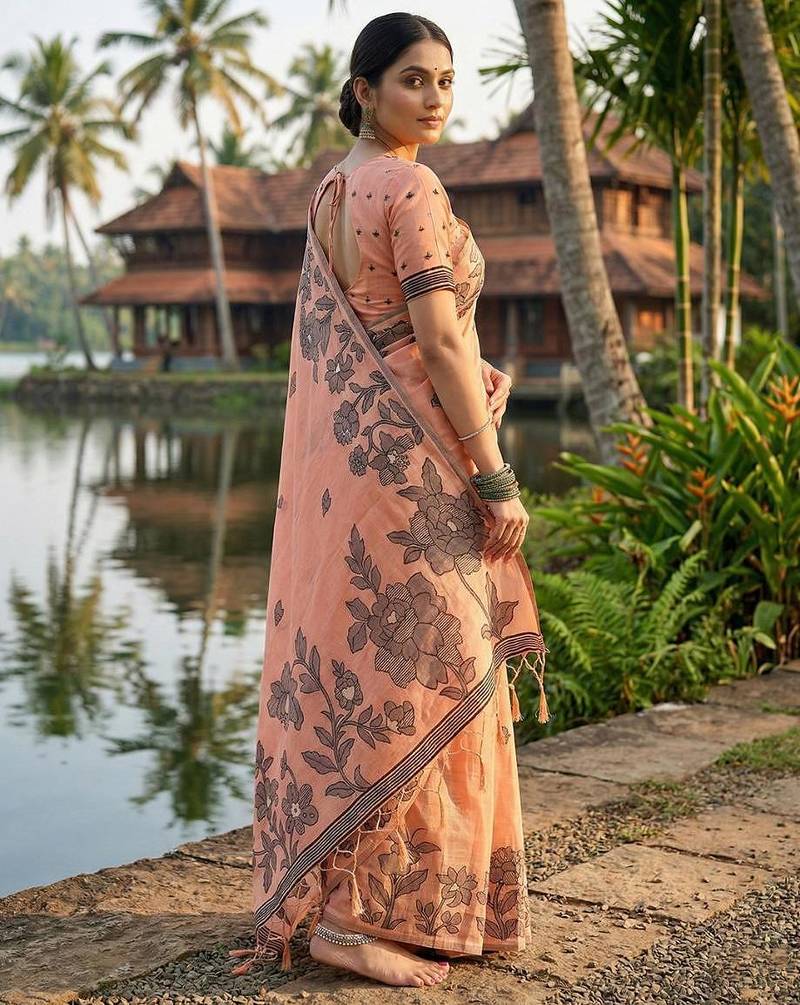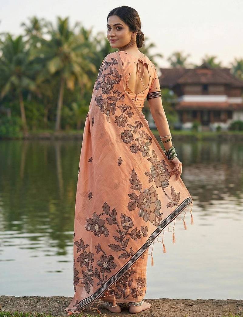 | Product Name | Orange Linen Cotton Print & Embroidered Work Saree With Blouse | |