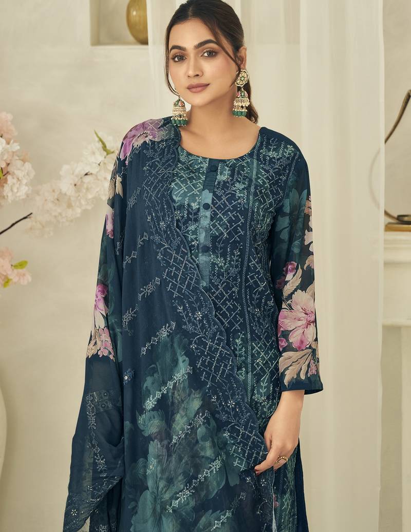 teal pure georgette embroidered dress material unstitched