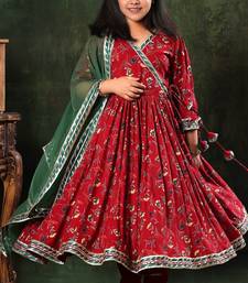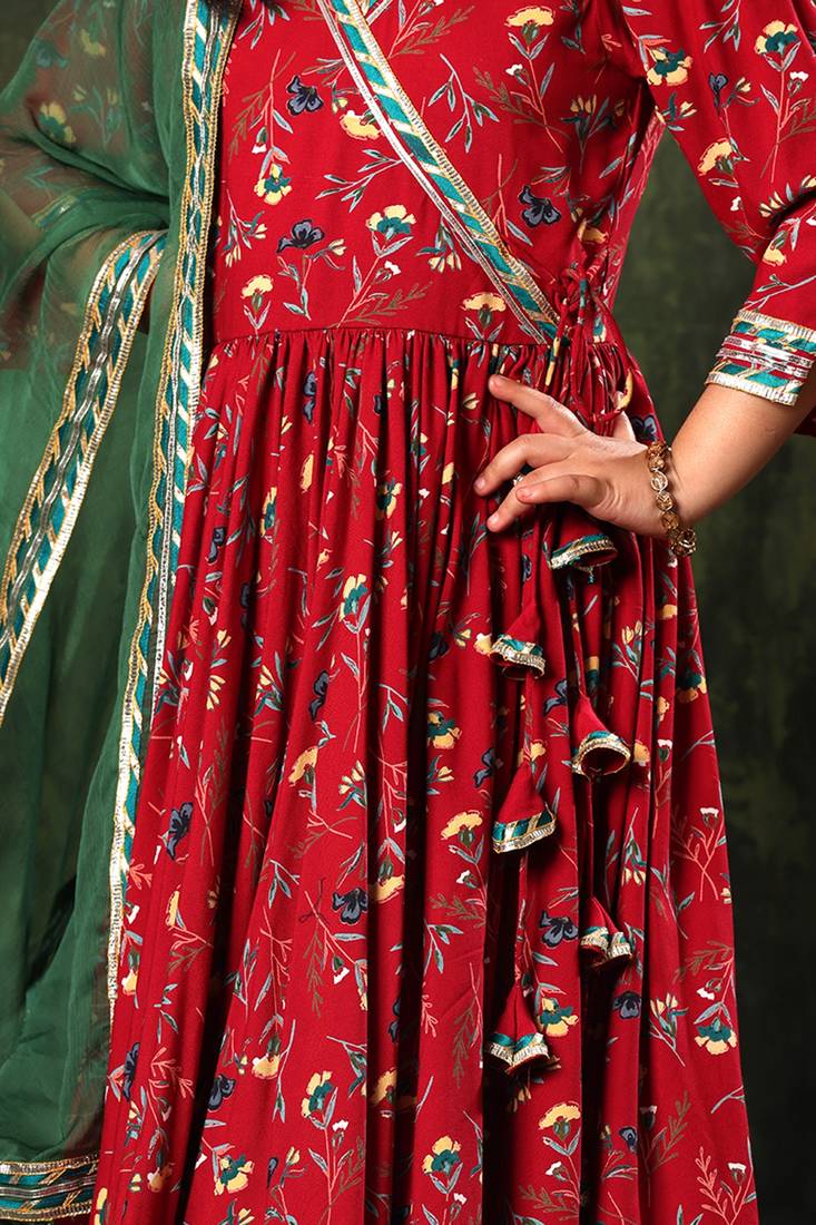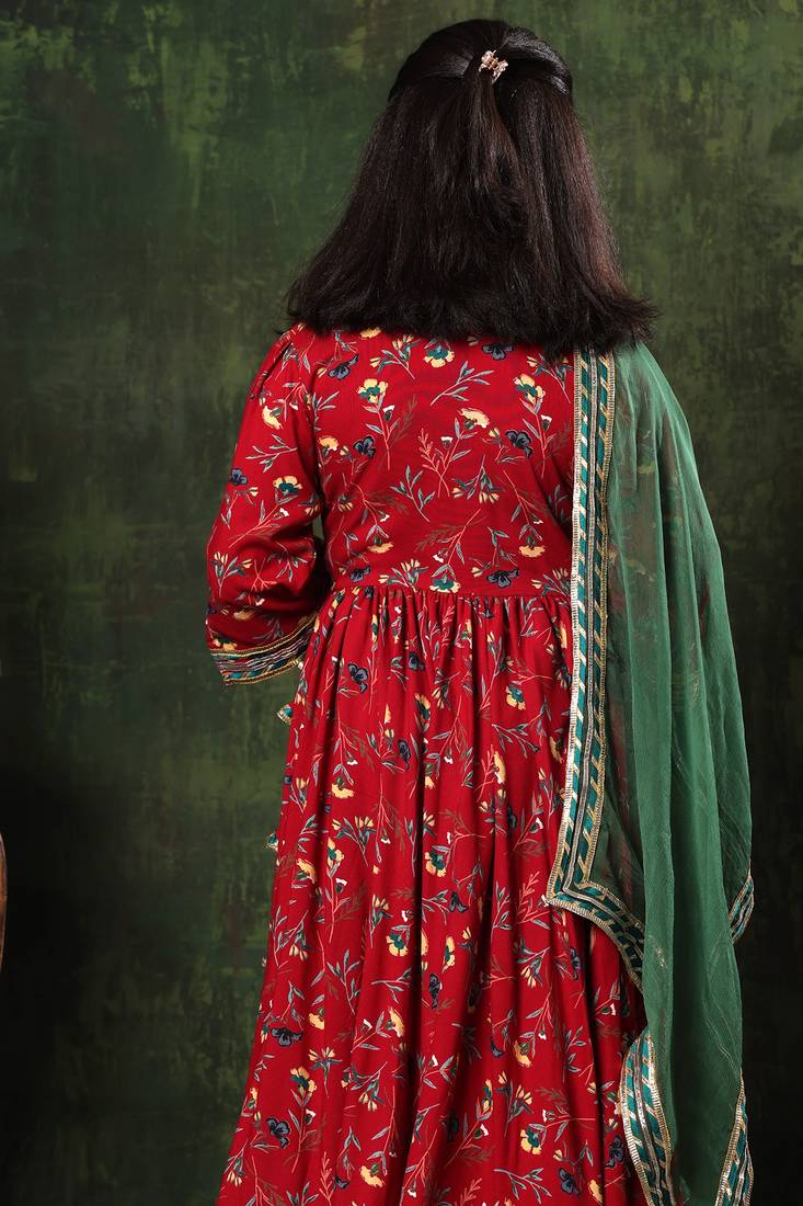 | Product Description | Elegant Ethnic Design: Beautiful Red Floral Printed Anarkali Style Dress That Gives A Graceful And Traditional Look For Girls Soft & Comfortable Fabric: Made From Lightweight And Breathable Fabric To Ensure All Day Comfort Stylish Flared Pattern: Attractive Flared Silhouette With Detailed Border Work That Adds Volume And Elegance Matching Dupatta Included: Comes With A Stylish Green Dupatta Featuring Decorative Border For A Complete Festive Outfit Perfect For Special Occasions: Ideal For Festivals, Weddings, Family Functions, And Traditional Celebrations. |
