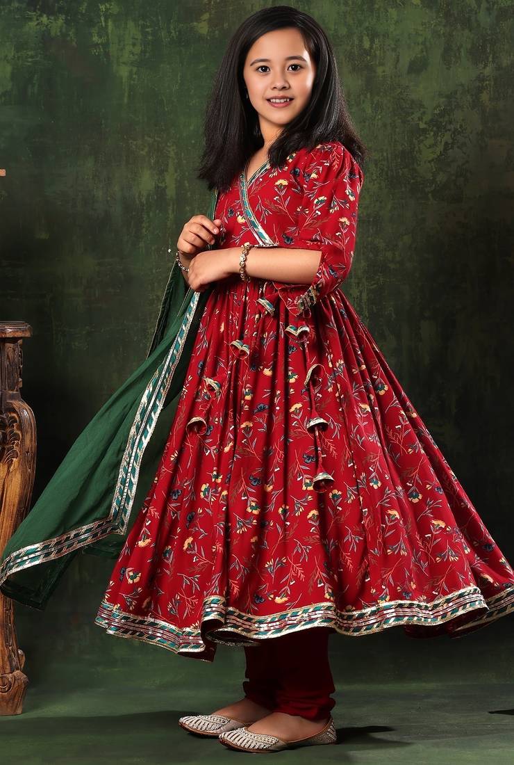 Red & green floral printed with border work cotton blend flared ethnic anarkali style girls kurta set with dupatta