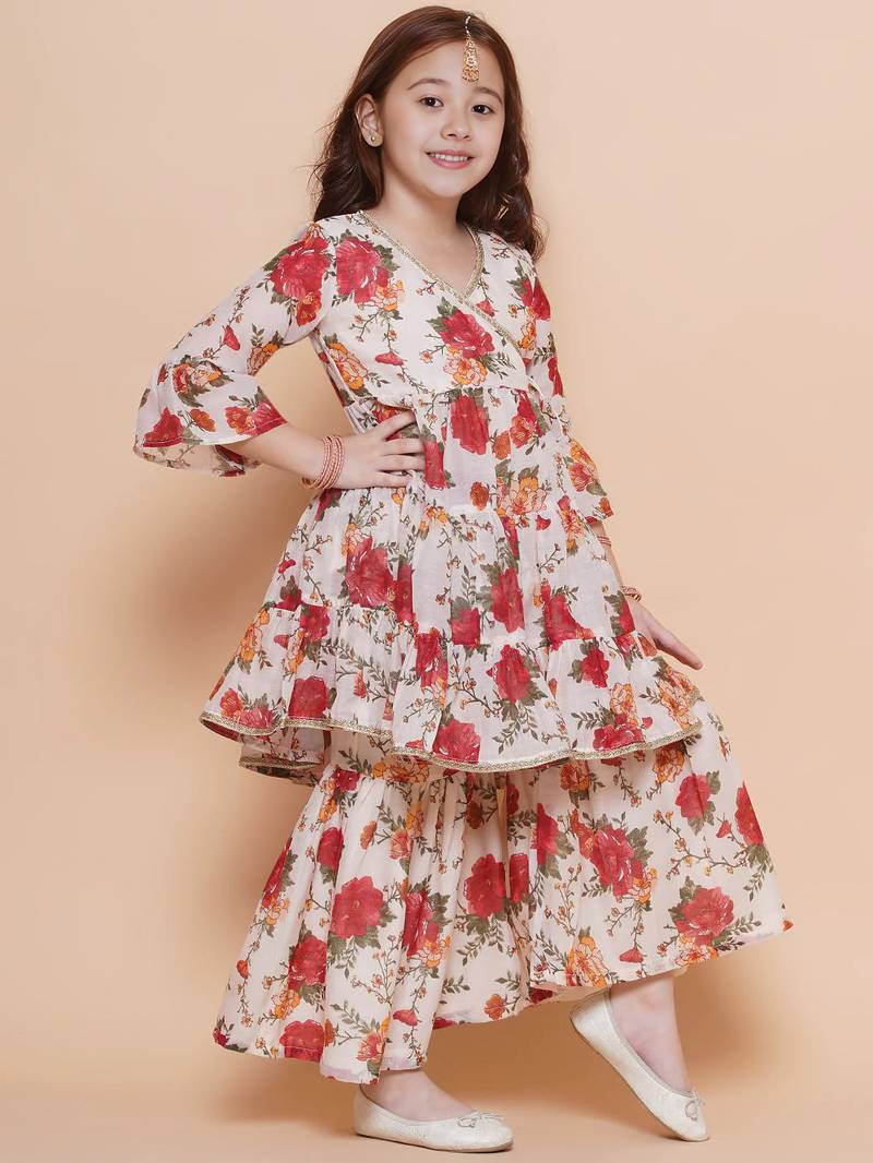 Red & orange floral print printed floral print design lightweight fabric flared peplum kurti girls ethnic sharara set