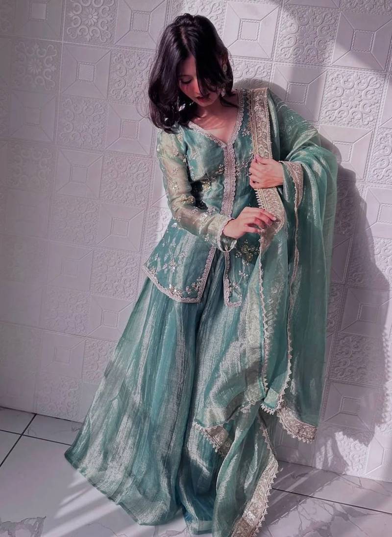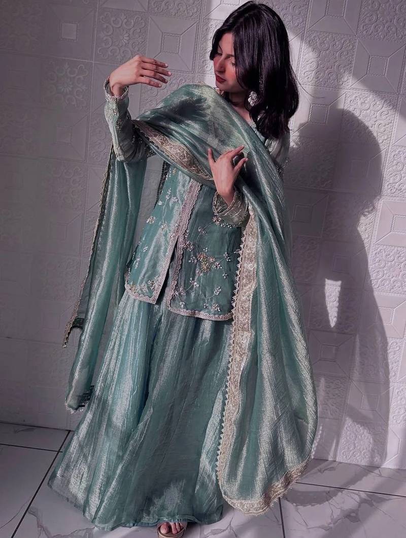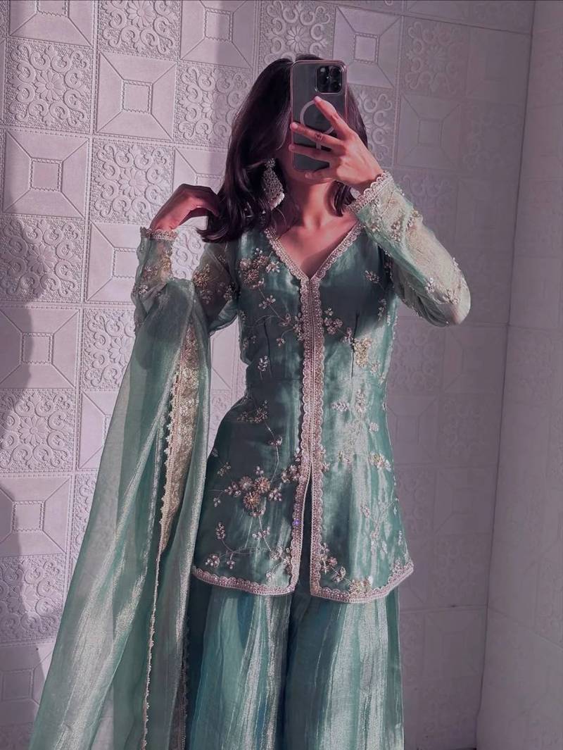 | Product Description | This Women’s Kurta Palazzo Set Is Crafted From Premium Fandy Silk Fabric, Offering A Smooth Texture With A Subtle Shimmer Finish. The Kurta Features Delicate Floral Embroidery Enhanced With Elegant Lace Border Detailing Along The Neckline, Sleeves, And Edges For A Refined Look. Paired With A Flowy Wide Leg Palazzo, It Creates A Graceful And Flattering Silhouette. The Rich Sheen And Soft Drape Of The Fabric Elevate Its Overall Appearance, Making It Perfect For Festive Wear, Party Wear, And Special Occasions.Women Kurta Palazzo Set, Festive Wear Kurta Set, Party Wear Ethnic Outfit, Silk Fabric Kurta Set, Shimmer Fabric Designer Suit, Pakistani Style Kurta Palazzo, Flared Kurta Set, Heavy Embroidered Kurta Set, Wedding Festive Wear, Traditional Ethnic Wear For Women, Trendy Kurta Set, Designer Palazzo Suit Set, Ethnic Party Wear Dress, Girls Festive Kurta Set |