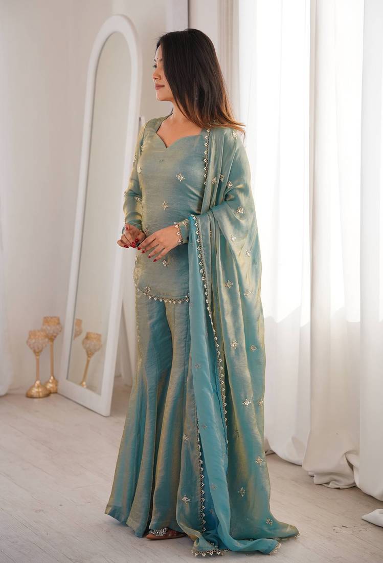 Women's shimmer silk sequins embroidered designer kurta sharara with dupatta set