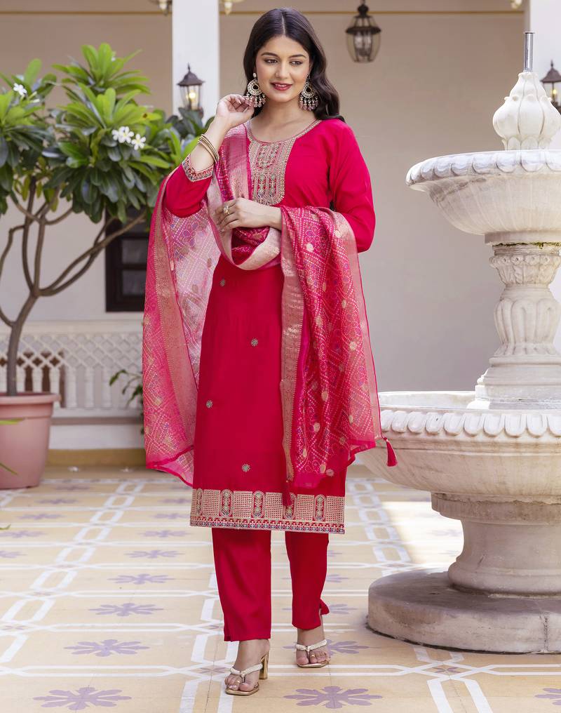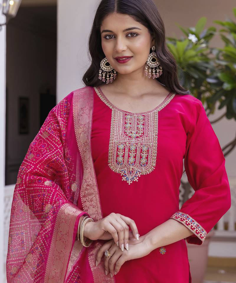 Step Into Festive Elegance With This Stunning Bright Pink Kurta Pant Set With Dupatta, Designed To Bring Out Your Traditional Charm With A Modern Touch. Crafted From Premium Quality Fabric, This Outfit Offers A Perfect Combination Of Comfort, Style, And Rich Ethnic Appeal, Making It Ideal For Special Occasions.The Kurta Features A Beautifully Detailed Embroidered Neckline With Intricate Zari And Thread Work, Adding A Luxurious And Refined Look. The Minimal Scattered Motifs On The Kurta Enhance Its Elegance Without Overpowering The Design. The Straight Fit Silhouette Ensures A Flattering And Comfortable Fit For All Body Types.Paired With Matching Straight Pants, This Outfit Creates A Complete Ethnic Ensemble Perfect For Festivals, Weddings, Family Functions, And Celebrations. Style It With Statement Earrings And Ethnic Footwear To Complete Your Graceful Festive Look.
