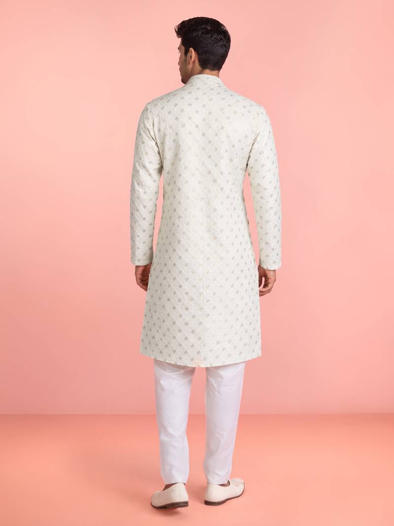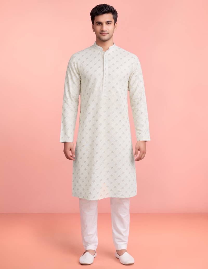 | Product Description | Cream Rayon Kurta Set Designed With Sequin Embroidery In A Geometric All Over Pattern. Features A Mandarin Collar, Concealed Closure, And Full Sleeves For A Structured Look. Paired With A White Cotton Pyjama, This Stitched Set Offers A Traditional Style Suitable For Weddings, Festive Gatherings, And Cultural Occasions. |