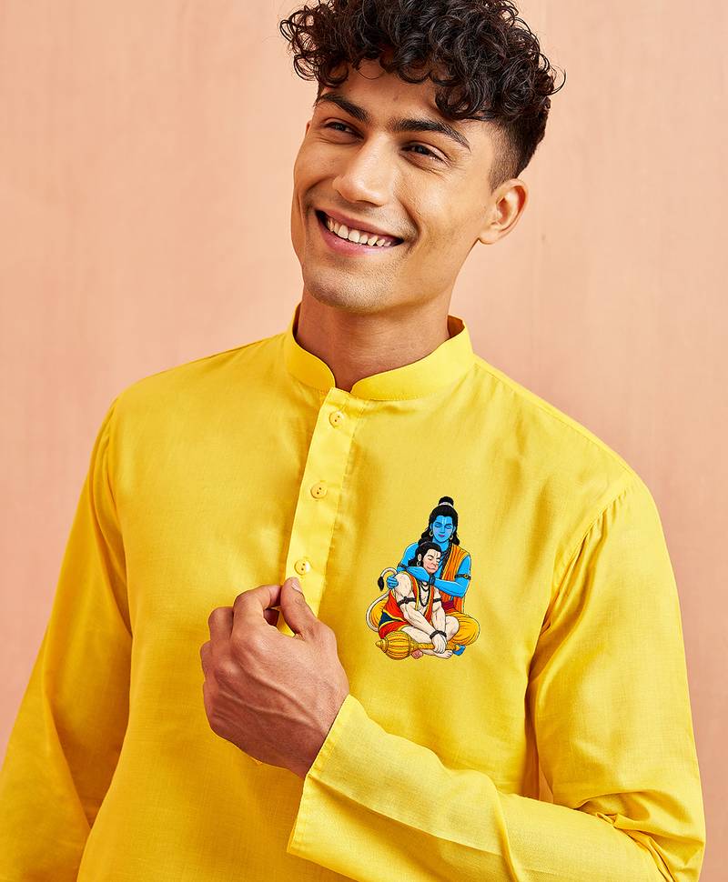 | Product Description | Yellow Cotton Kurta Set Featuring A Hanumanji Placement Print On The Chest. Designed With A Mandarin Collar, Full Sleeves, And A Straight Knee Length Silhouette With Side Slits. Paired With A White Cotton Pyjama, This Stitched Outfit Offers A Traditional Look Suitable For Festive And Cultural Occasions. |