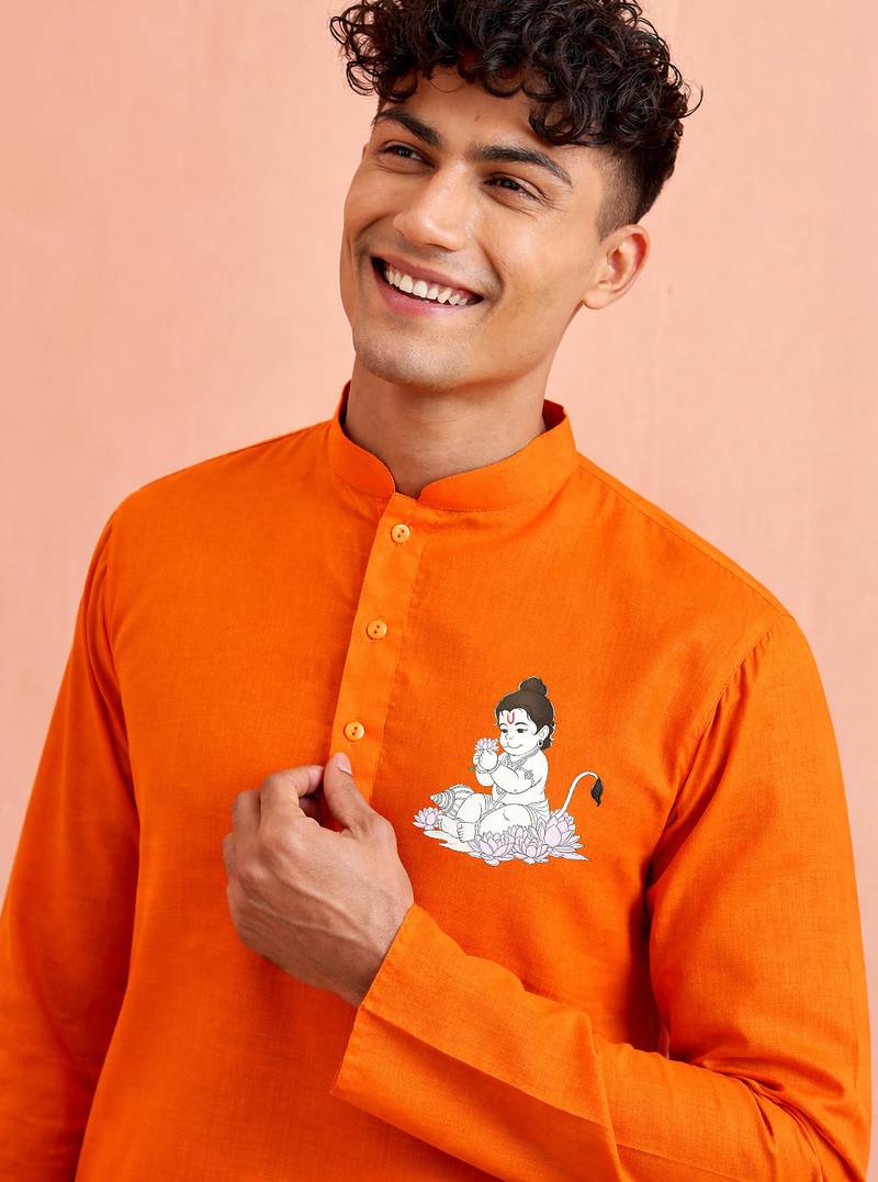 | Product Description | Orange Cotton Kurta Set Featuring A Bal Hanumanji Placement Print On The Chest. Designed With A Mandarin Collar, Full Sleeves, And A Straight Knee Length Silhouette With Side Slits. Paired With A White Cotton Pyjama, This Stitched Outfit Offers A Traditional Look Suitable For Festive And Cultural Occasions. |