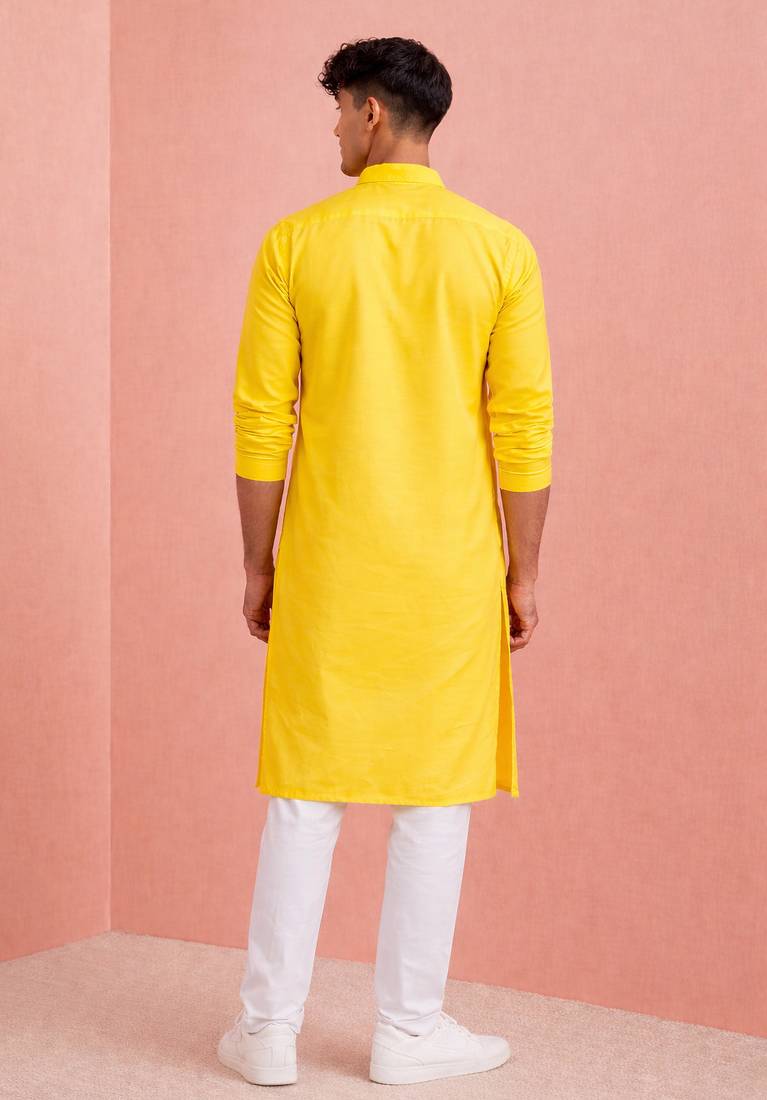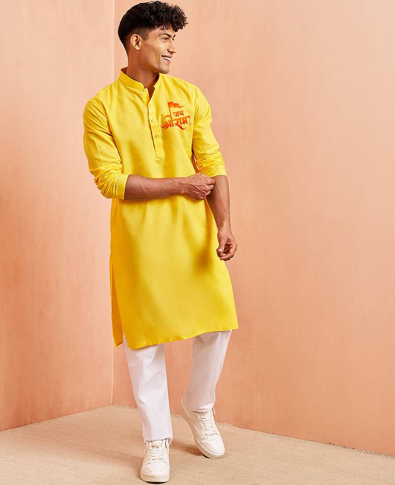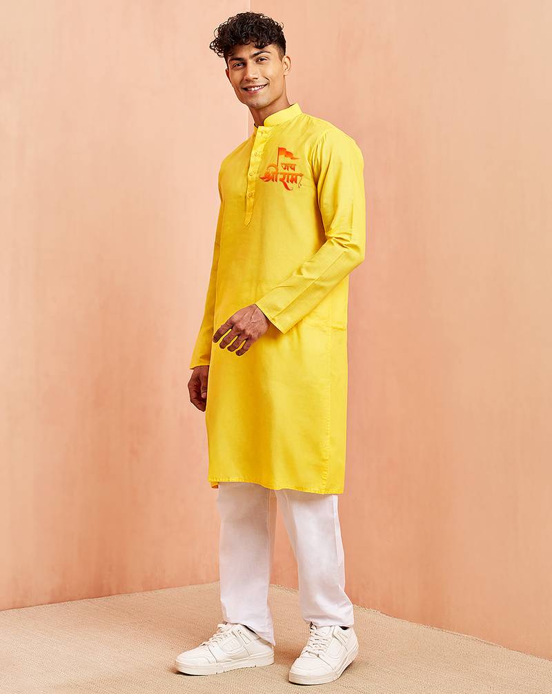 | Product Description | Yellow Cotton Kurta Set Featuring A Shri Ram Placement Print On The Chest. Designed With A Mandarin Collar, Full Sleeves, And A Straight Knee Length Silhouette With Side Slits. Paired With A White Cotton Pyjama, This Stitched Outfit Offers A Traditional Look Suitable For Festive And Cultural Occasions. |