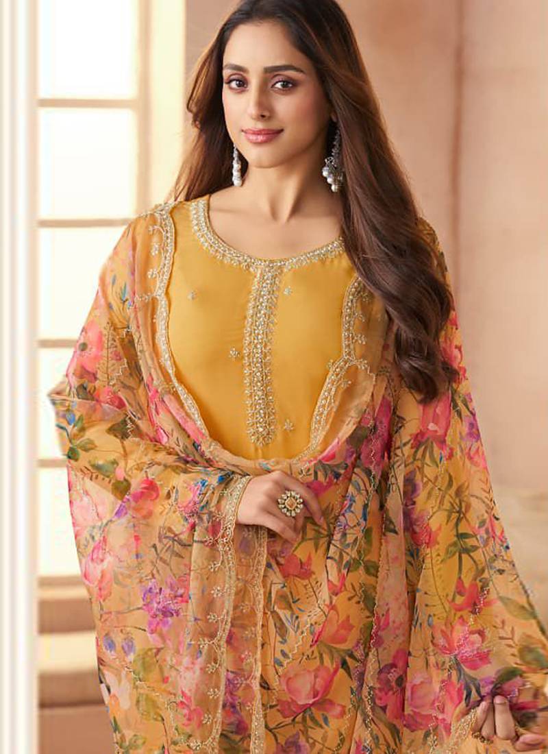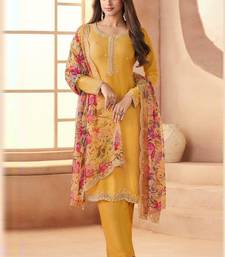 Yellow bids work soft chiffon salwar suit unstitched