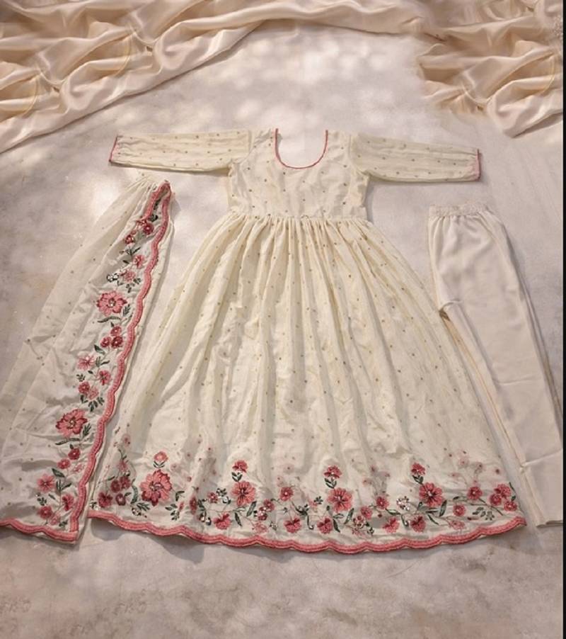 Off white vichitra silk emmbroidery party wear suit set stitched